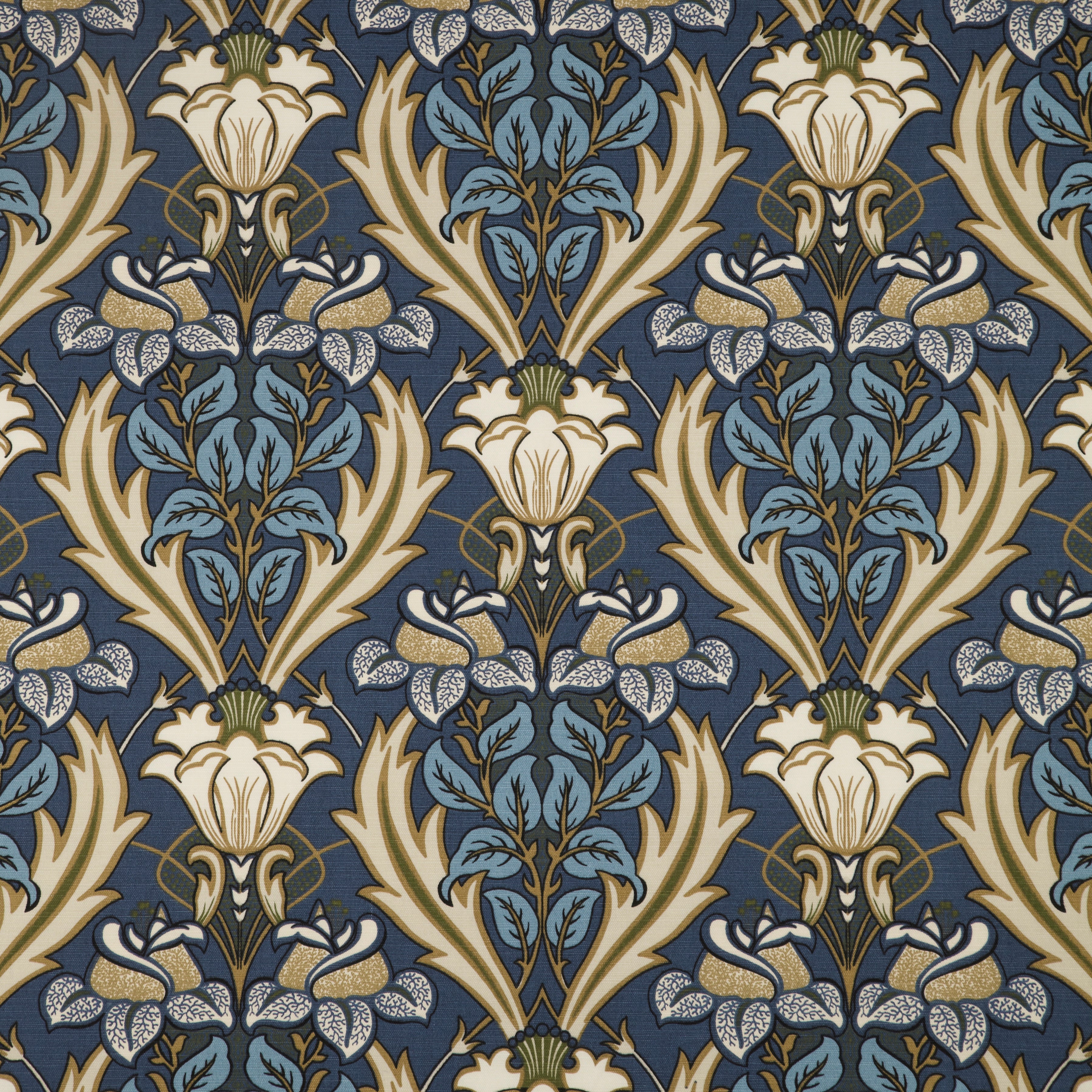 The 100% cotton Acanthus printed material will add a romantic, art nouveau-inspired pattern to your decor. With a navy background and a variety of gold and cream hues that add depth and detail to the busy repetitive composition, this unique symmetrical design is very detailed.