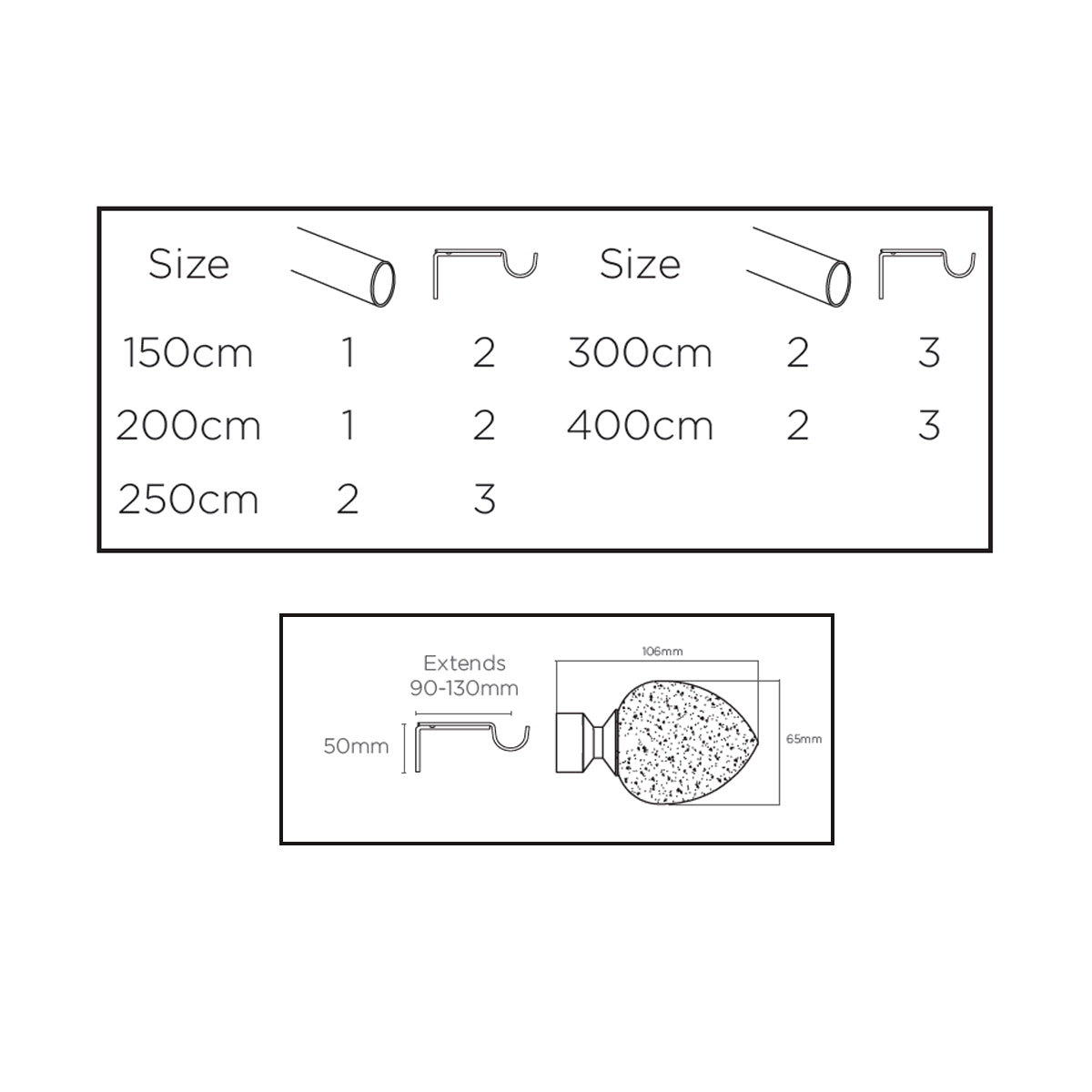 The Alexia finial has a dimension of 65mm x 106mm, this fixed size pole can be cut to size by taking an even amount from each end and comes complete with adjustable wall supports which extend from 90mm to 130mm x 50mm. Please note: this pole is an eyelet pole and if you require a curtain pole with rings please look at our Curtain Poles category to view all our poles with rings included.
