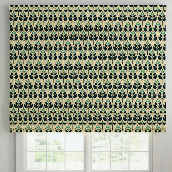 This made-to-measure Roman blind comes from the ANTE DECOR collection, showcasing the Cadiz Printed Cotton fabric. The fabric features a timeless design with repeating trees and vibrant leaves against a warm background, embodying a classic retro style. Discover the elegance and charm this distinctive pattern brings to any room.