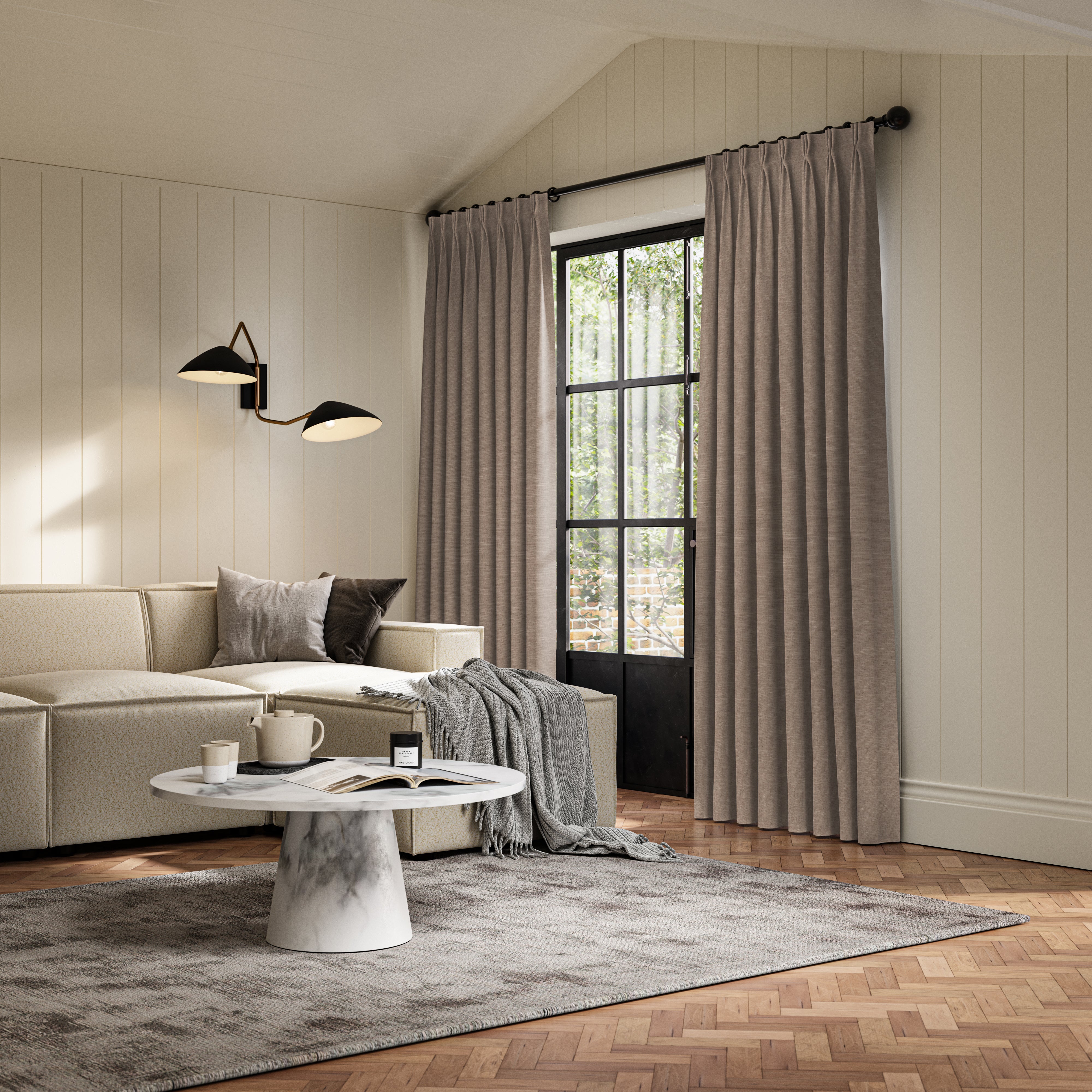 This fabric offers the delicate appearance of a sheer while providing complete blackout functionality, blocking all light effectively. Available in various shades, the curtains are unlined to maximise the fabric’s inherent blackout quality without added bulk. Crafted from extra-wide material, these curtains require no seams to achieve the desired width, ensuring a smooth, elegant finish.