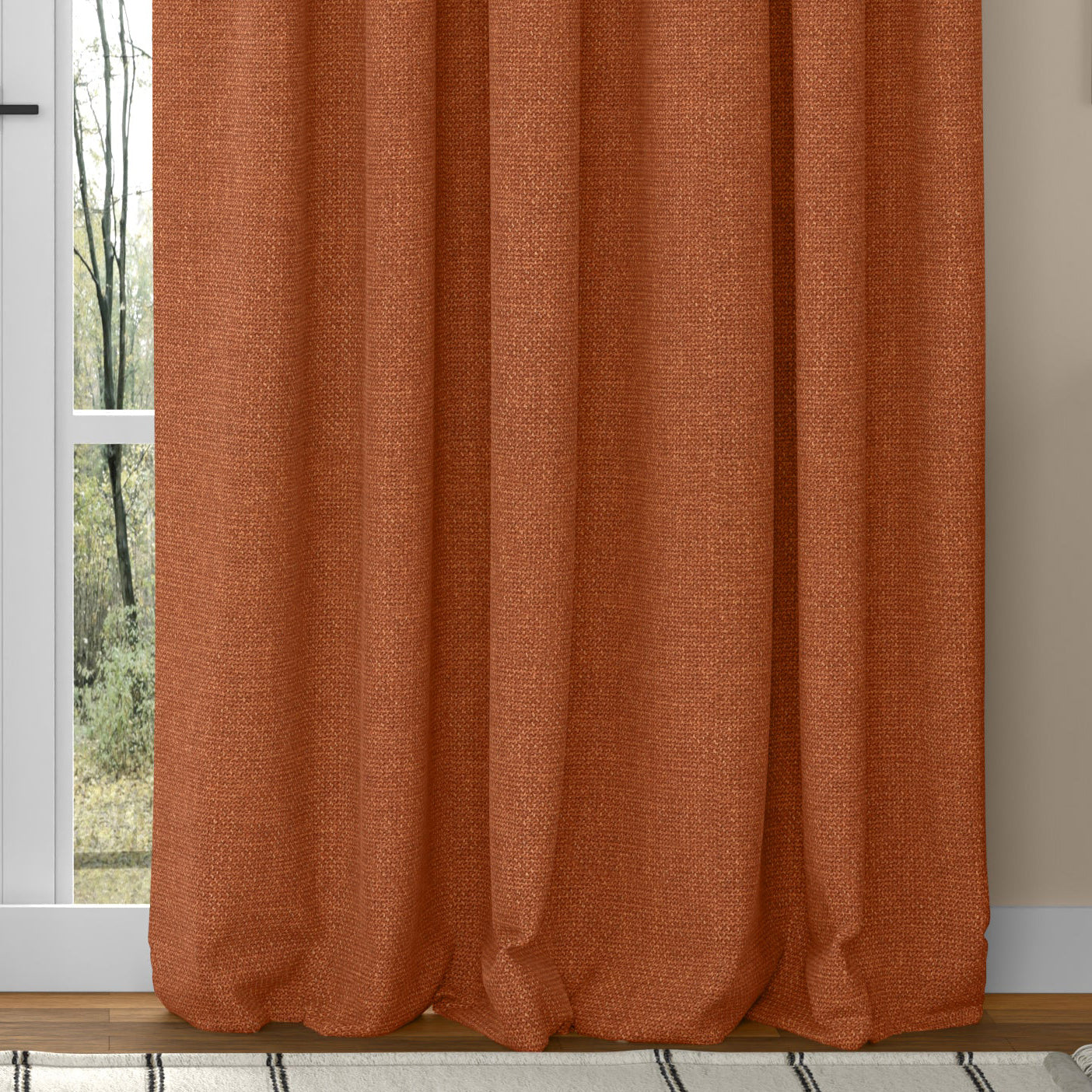 The ANTE DECOR Fjord Rust made to measure curtains offer a tailored solution for your window dressing needs, crafted from 100% polyester for durability and easy maintenance. Designed to fit your exact specifications, these curtains combine functionality with a rich rust hue that adds warmth and sophistication to any room. The polyester fabric ensures resistance to fading and creasing, making them ideal for long-term use while maintaining a polished appearance. Perfect for enhancing privacy and controlling natural light, these custom curtains bring both style and practicality to your living space.
