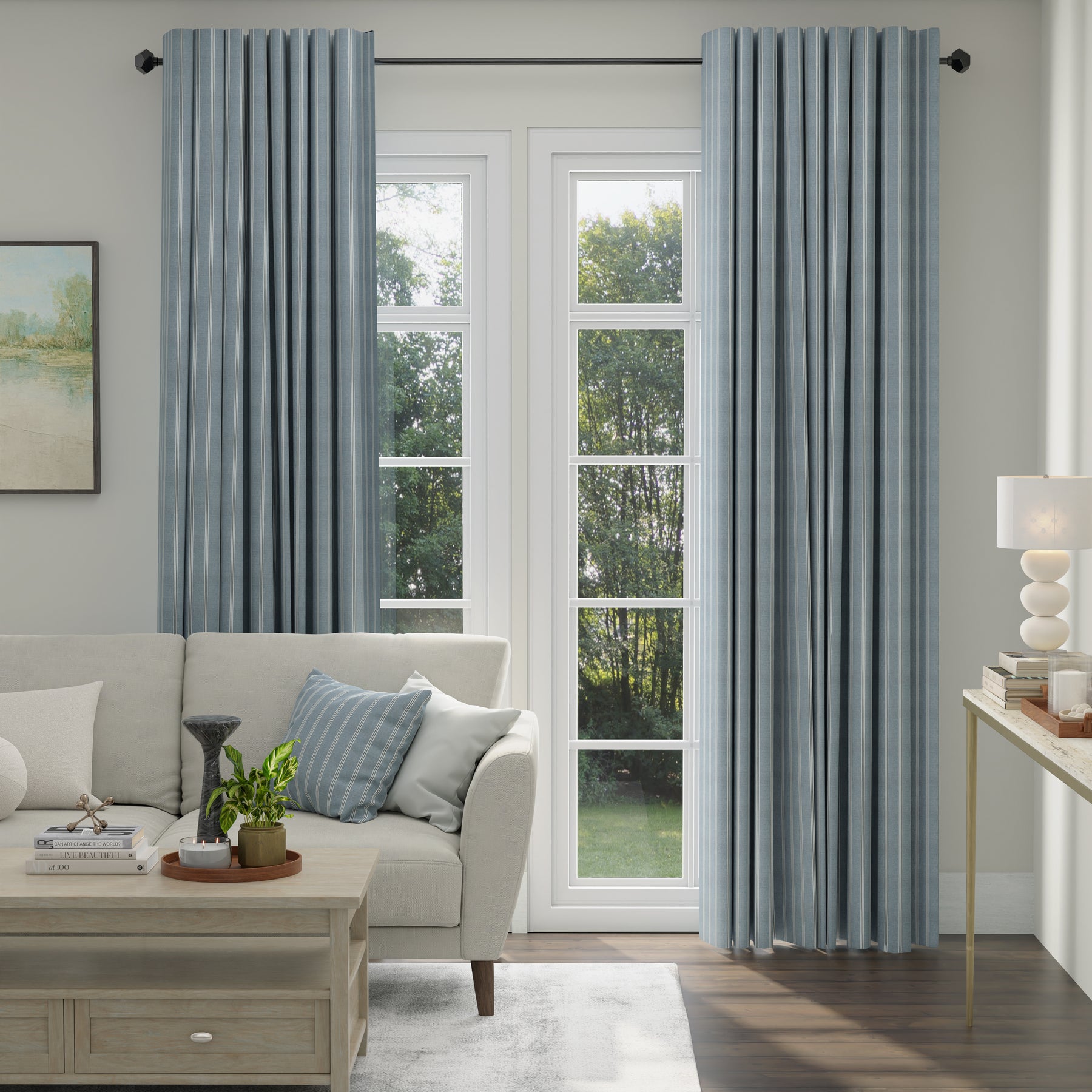 These made-to-measure curtains from the ANTE DECOR range exemplify timeless elegance. Crafted from 100% cotton, the Latham Printed Cotton Stripe Fabric in Blue on Blue features subtle tonal backgrounds accented by delicate light and coloured stripes. Ideal for curtains, Roman blinds, and more, its refined blue hues bring a nautical feel, making it an excellent choice for children's rooms and play areas. Combining superior materials with a distinguished design, this fabric enhances any interior with lasting style and quality.