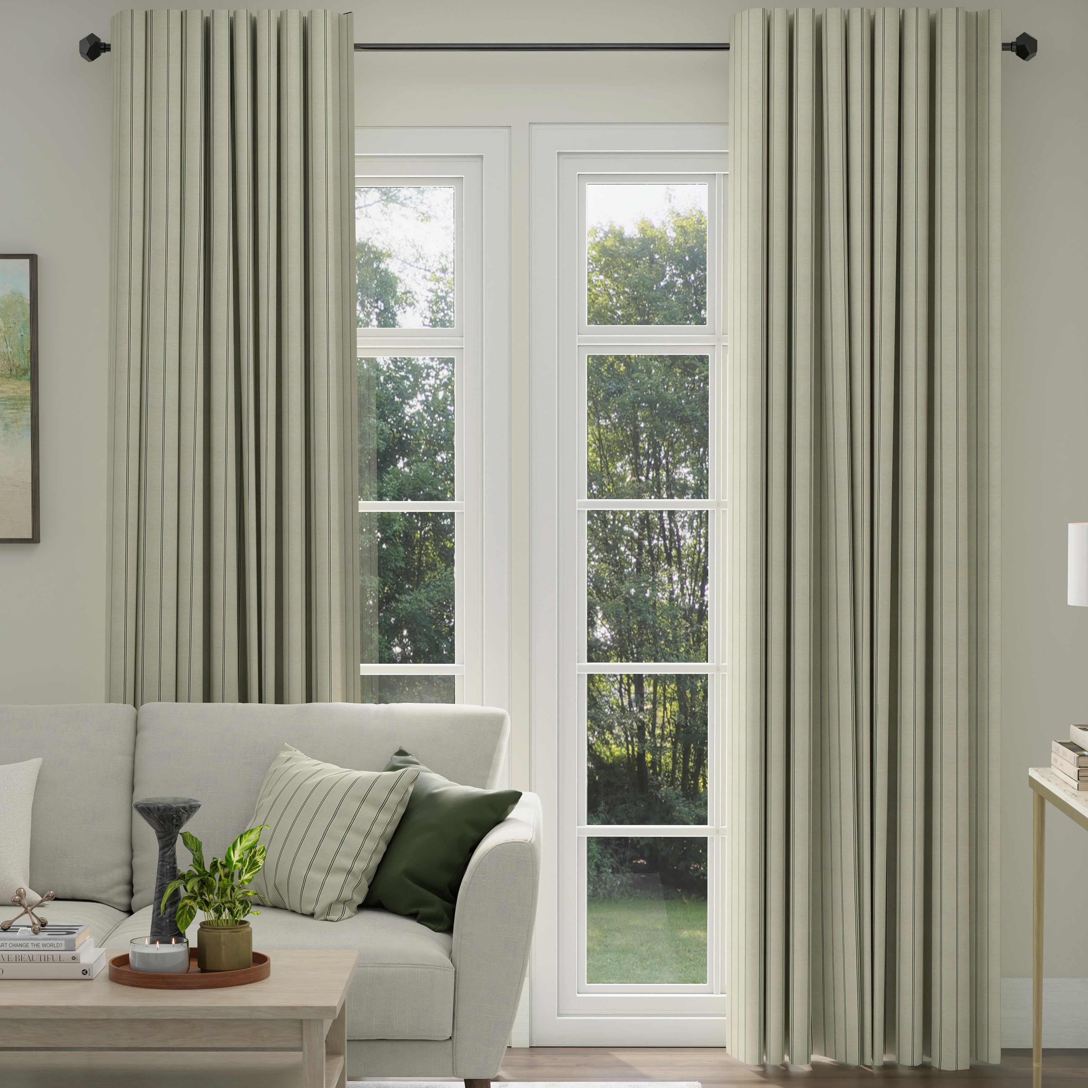 This made-to-measure curtain features fabric from the ANTE DECOR range. The Latham Printed Cotton Stripe in Charcoal combines subtle classic background hues with contrasting light and coloured stripes, offering a sophisticated and enduring style. Crafted from 100% cotton, it is ideal for Roman blinds or curtains, delivering a plush and elegant finish. The detailed charcoal stripes on a light beige base create a polished and versatile look, suitable for a range of interior design applications.