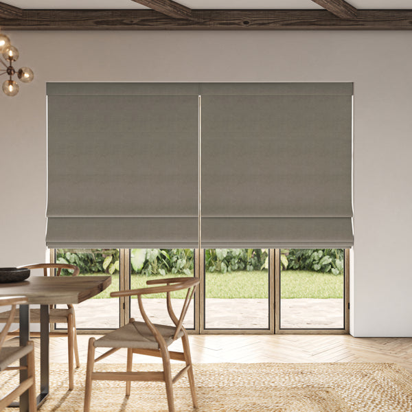 This blind features a thick, plush chenille-style fabric with a luxurious sheen and soft pile, making it perfect for main living spaces. Available in a selection of timeless, elegant shades. The material is naturally blackout, completely preventing light transmission without the need for lining. Designed unlined to maintain a sleek, lightweight appearance while effectively blocking light. Crafted from extra-wide fabric, these Roman blinds are created without seams, delivering a flawless finish on both front and back. We suggest ordering a sample to evaluate the colour and fabric texture within your own environment.