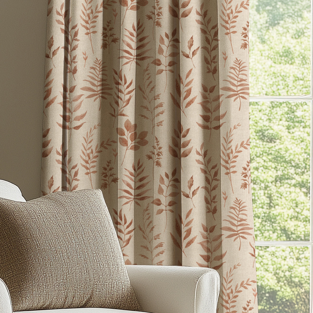 Crafted from premium 100% cotton, these ANTE DECOR Willow curtains showcase a sophisticated botanical design with delicate leaf motifs scattered across a warm, neutral linen base. The harmonious colour palette creates a refined aesthetic that complements contemporary and traditional interiors alike. Made to measure for a bespoke fit, these printed curtains deliver both visual elegance and practical functionality to any room.