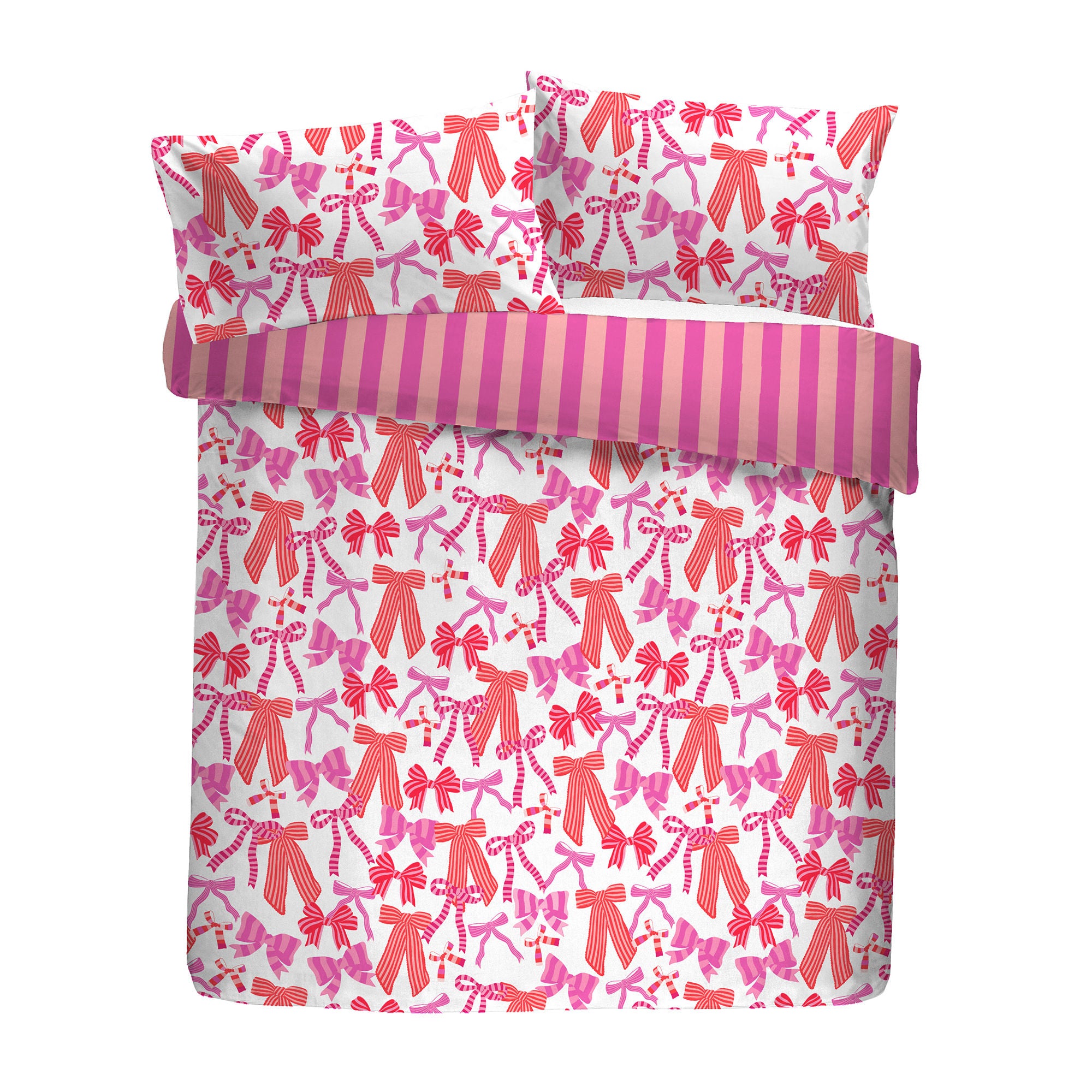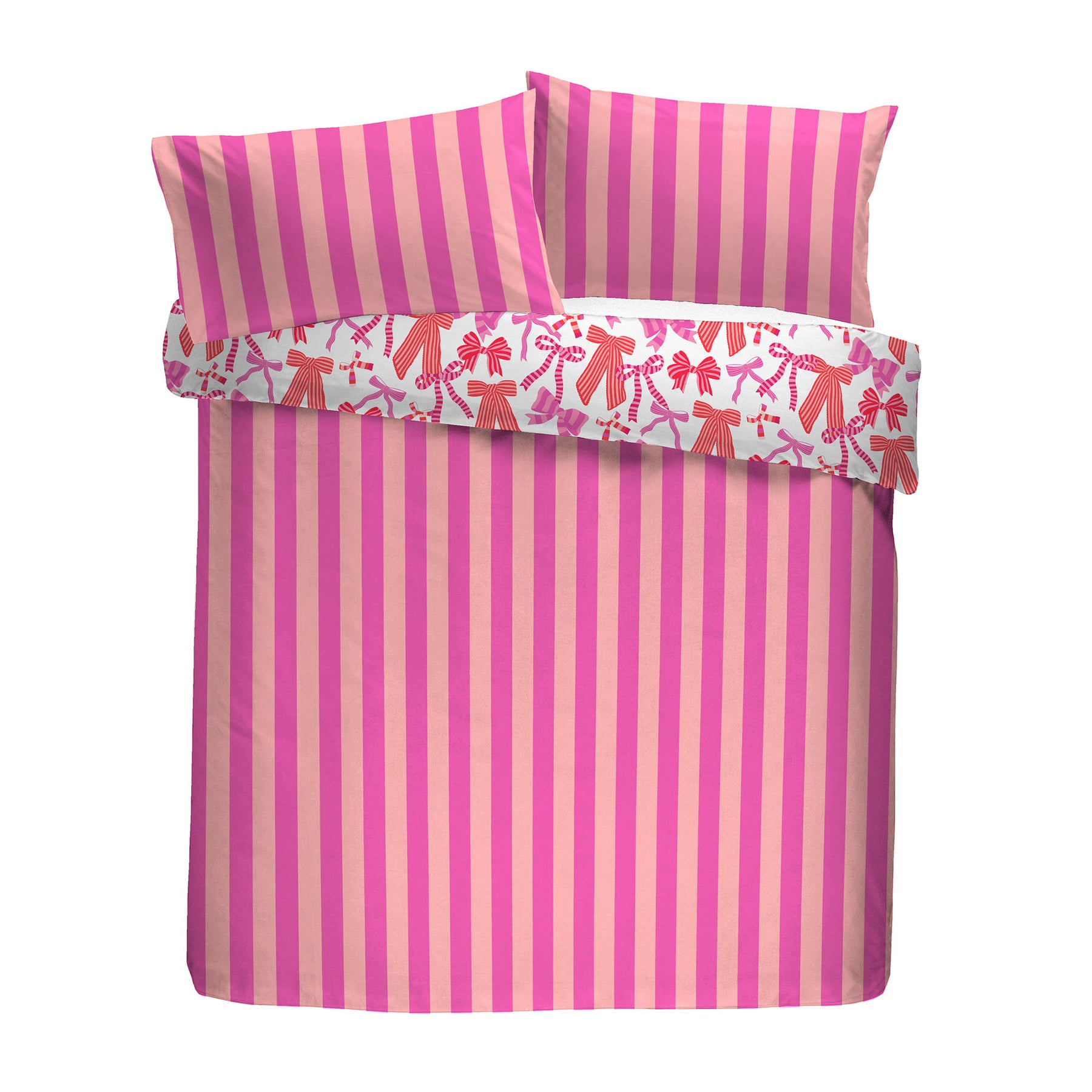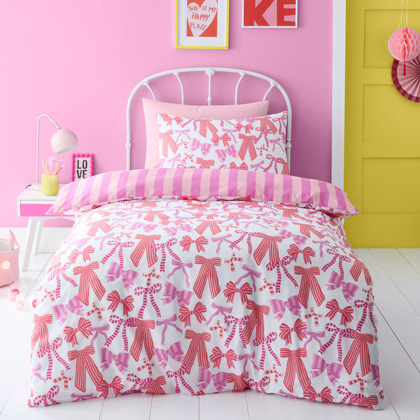 Discover the vibrant charm of the Bedlam Bows & Stripes Duvet Cover Set. Featuring striking pink bows against a crisp white background and broad stripes on the reverse, this reversible bedding offers versatile style. Crafted from low-maintenance polyester, it combines playful design with practical care for a distinctive bedroom update.