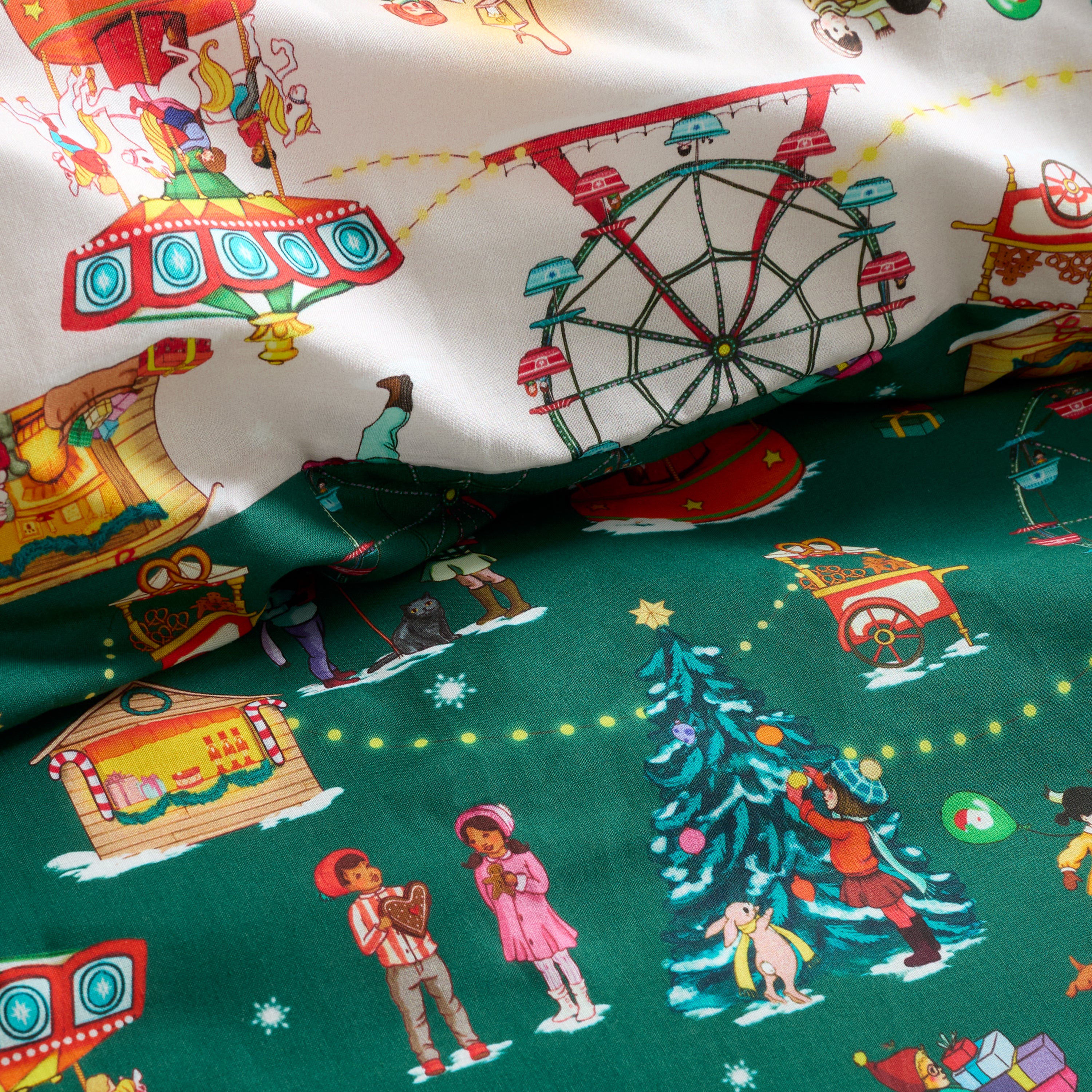 Experience the enchantment of Christmas with this beautifully designed bedding set. Featuring a rich evergreen background, it showcases children enjoying festive fairground rides, carol singing, and visits to Santa’s grotto, capturing the essence of winter celebrations. The intricate, vibrant design is achieved through fine detail digital printing. Fully reversible and made from 100% cotton, this set offers a soft, breathable, and comfortable sleep environment for your child.