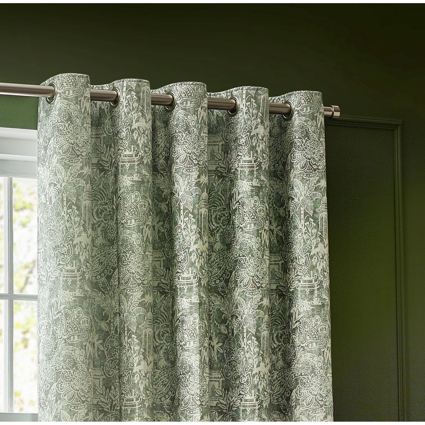 The Bengal Chenille Ready Made Eyelet Curtains Sage beautifully capture the essence of faraway lands with their bold, rich tones. These eye-catching curtains feature a stunning Bengal Tiger surrounded by a lush jungle landscape, printed on luxurious chenille fabric. Available in a variety of modern, monochromatic shades, this design is sure to spark conversation and admiration.