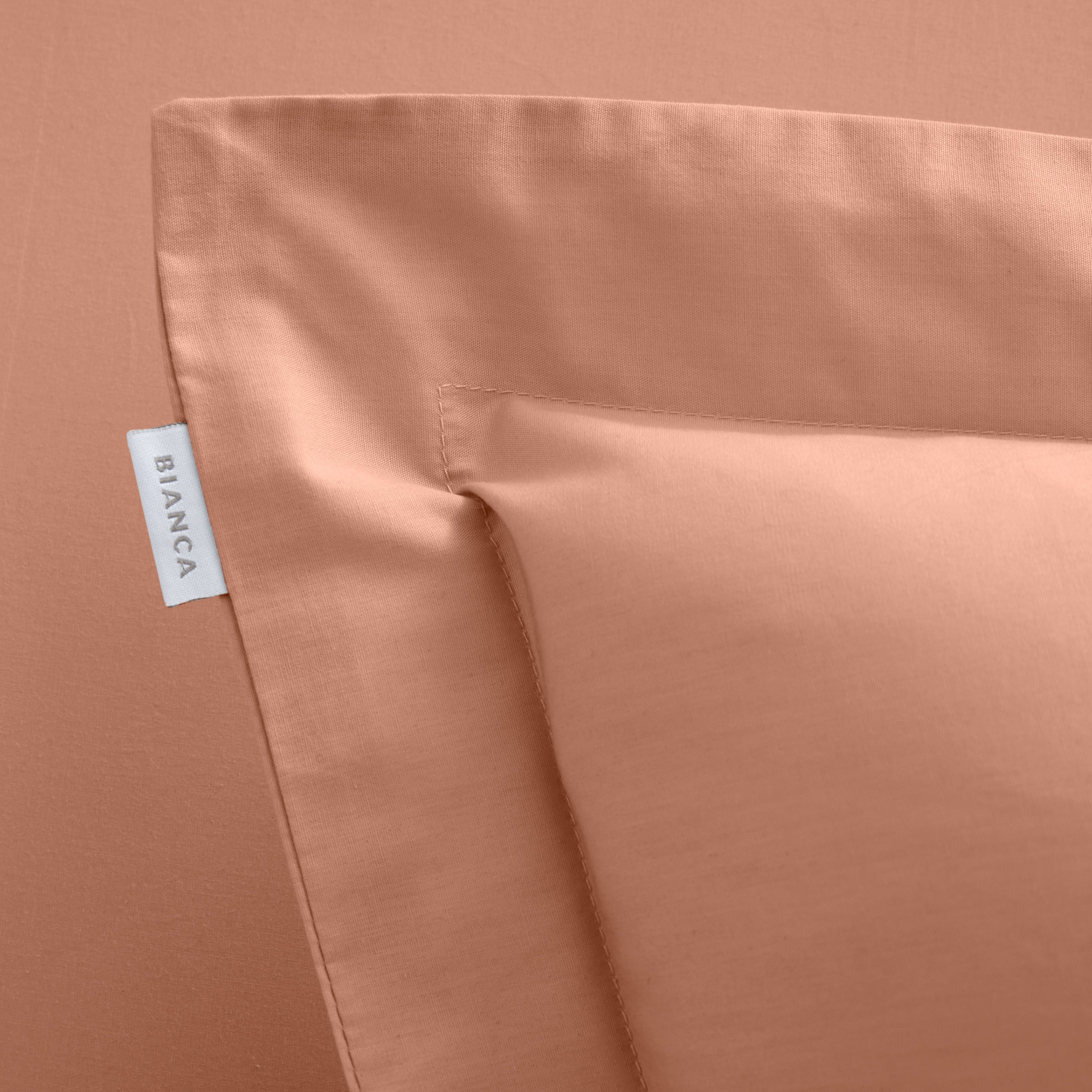 Indulge in a state of relaxation and comfort with Bianca's luxurious 200 thread count cotton percale Oxford pillowcases in clay. Made from pure, breathable cotton, this collection is designed to promote a better night's sleep by regulating temperature. Enjoy the timeless style and peaceful atmosphere this bedding provides, while maintaining safety and quality standards certified by MADE IN GREEN by OEKO-TEX®.