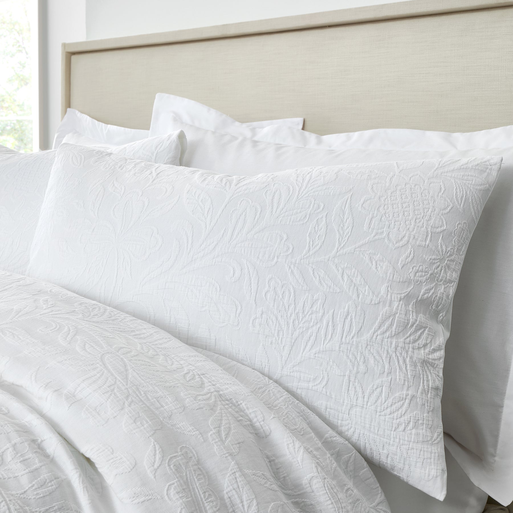 Experience enduring elegance with our woven matelassé jacquard, featuring a delicate floral damask design that adds gentle texture and dimension. Presented on a pristine white background, its intricate detailing imparts a quiet luxury. Rest peacefully beneath the luxuriously soft 200 thread count percale cotton, a naturally breathable fabric that promotes restful, comfortable sleep.