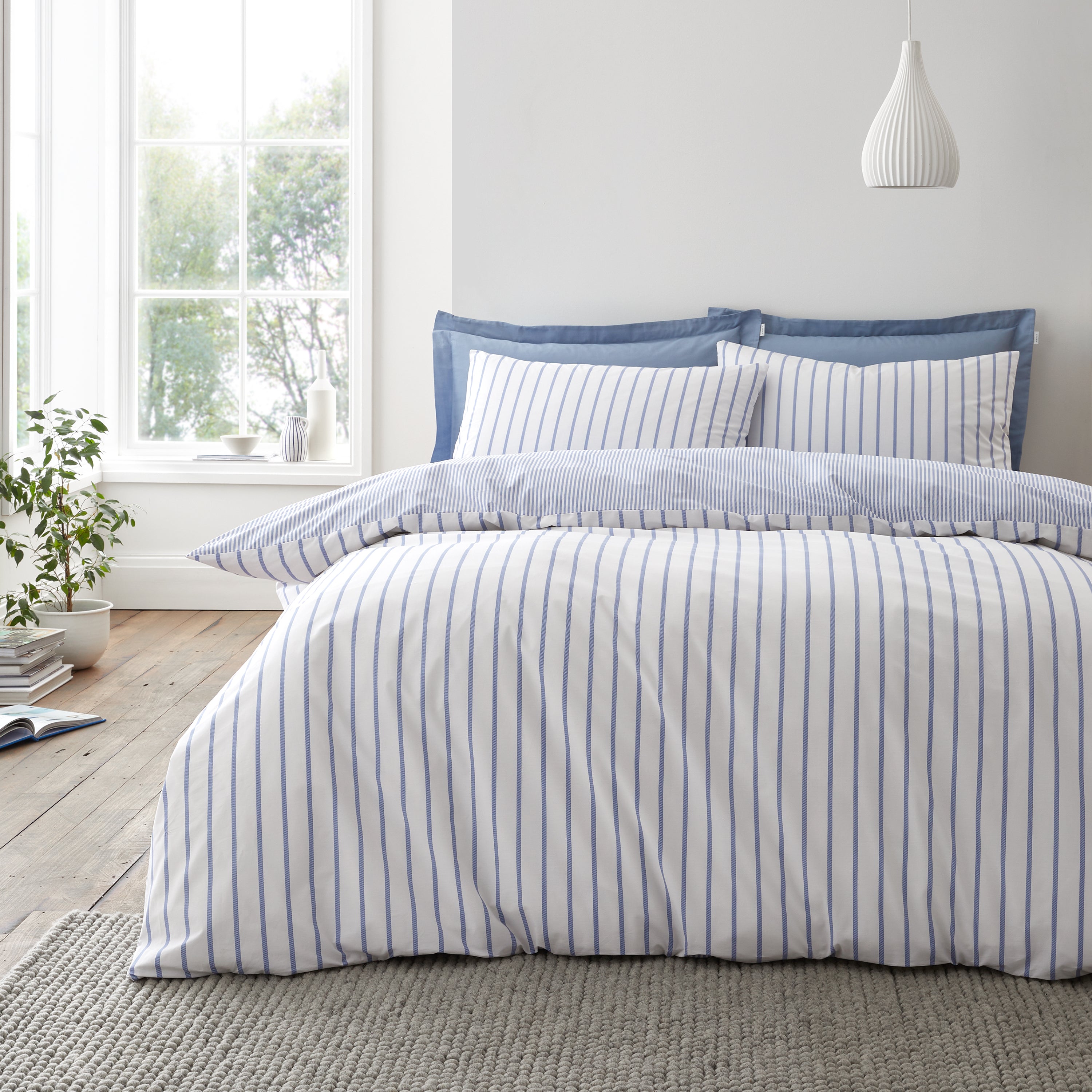 Transform your bedroom into a serene retreat with the Bianca Hampton Stripe Duvet Cover Set. This expertly crafted bedding showcases a sophisticated striped design in calming blue tones, offering visual interest from both sides with its reversible construction—bold stripes on one side, delicate detailing on the reverse. Woven from premium 200 thread count percale cotton, the fabric delivers exceptional breathability and softness for restorative sleep. The natural properties of percale ensure optimal temperature regulation throughout the night. Certified to MADE IN GREEN by OEKO-TEX® standards, this set combines timeless design with responsible manufacturing, making it an intelligent choice for the discerning homeowner seeking quality bedding that aligns with both comfort and ethical values.