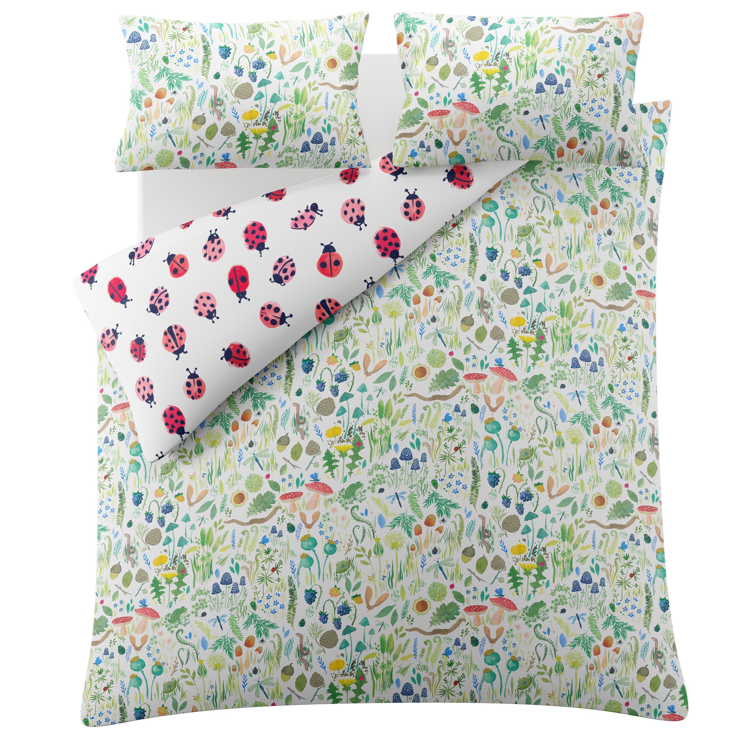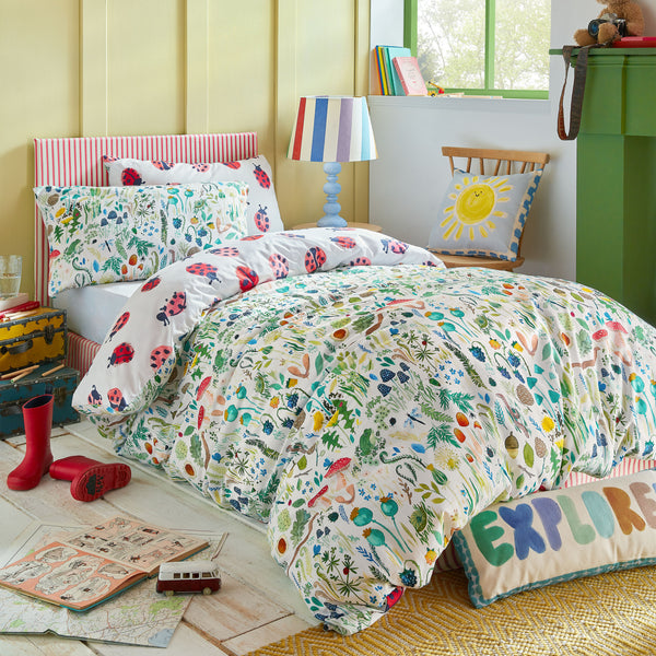 This charming design invites you down a garden path adorned with sweet toadstools and wild foliage, where playful frogs await discovery. Perfect for adventurous children who love exploring, splashing in puddles, collecting acorns, and climbing trees, it captures the spirit of a young explorer and forager. The reversible duvet cover’s second pattern features beloved ladybirds, celebrated by gardeners and children alike, adding a delightful touch to any child’s room. Printed on natural white 100% cotton, it comes in single and double sizes. Each set includes a duvet cover and two pillowcases (single sets include one pillowcase).