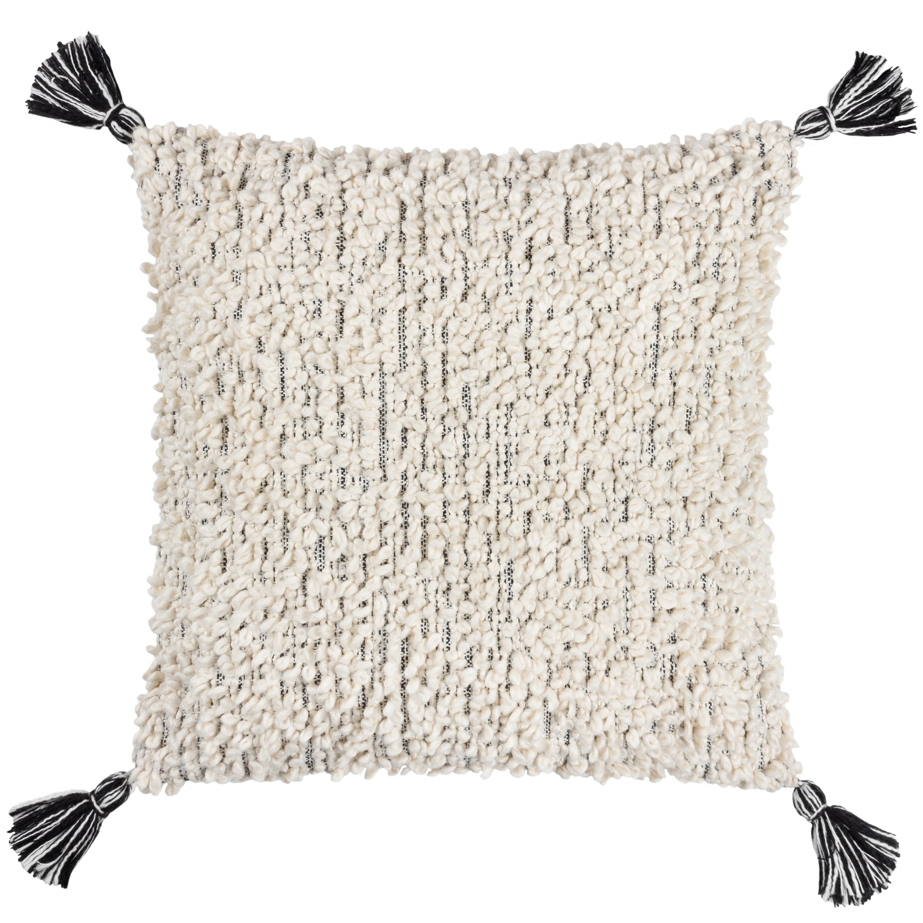 Four large, dual-toned corner tassels lend flair to the soft boucle fleece refined quality yarn face of the Cambre cushion. A piece that works well for layering soft textures in a carefree, neutral setting to get a minimalist bohemian look.