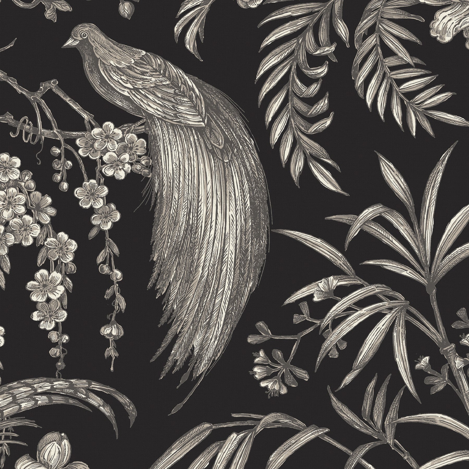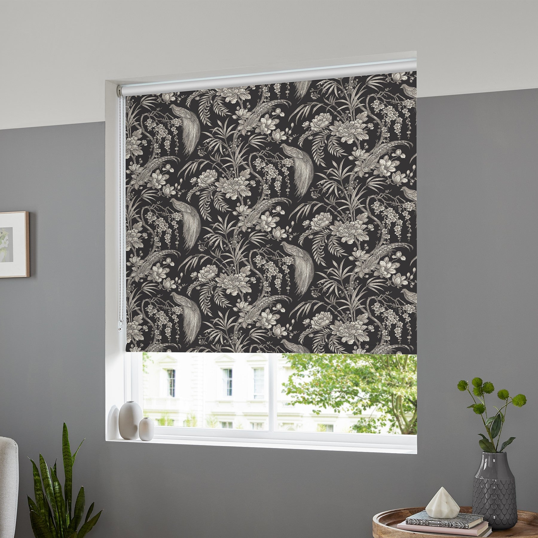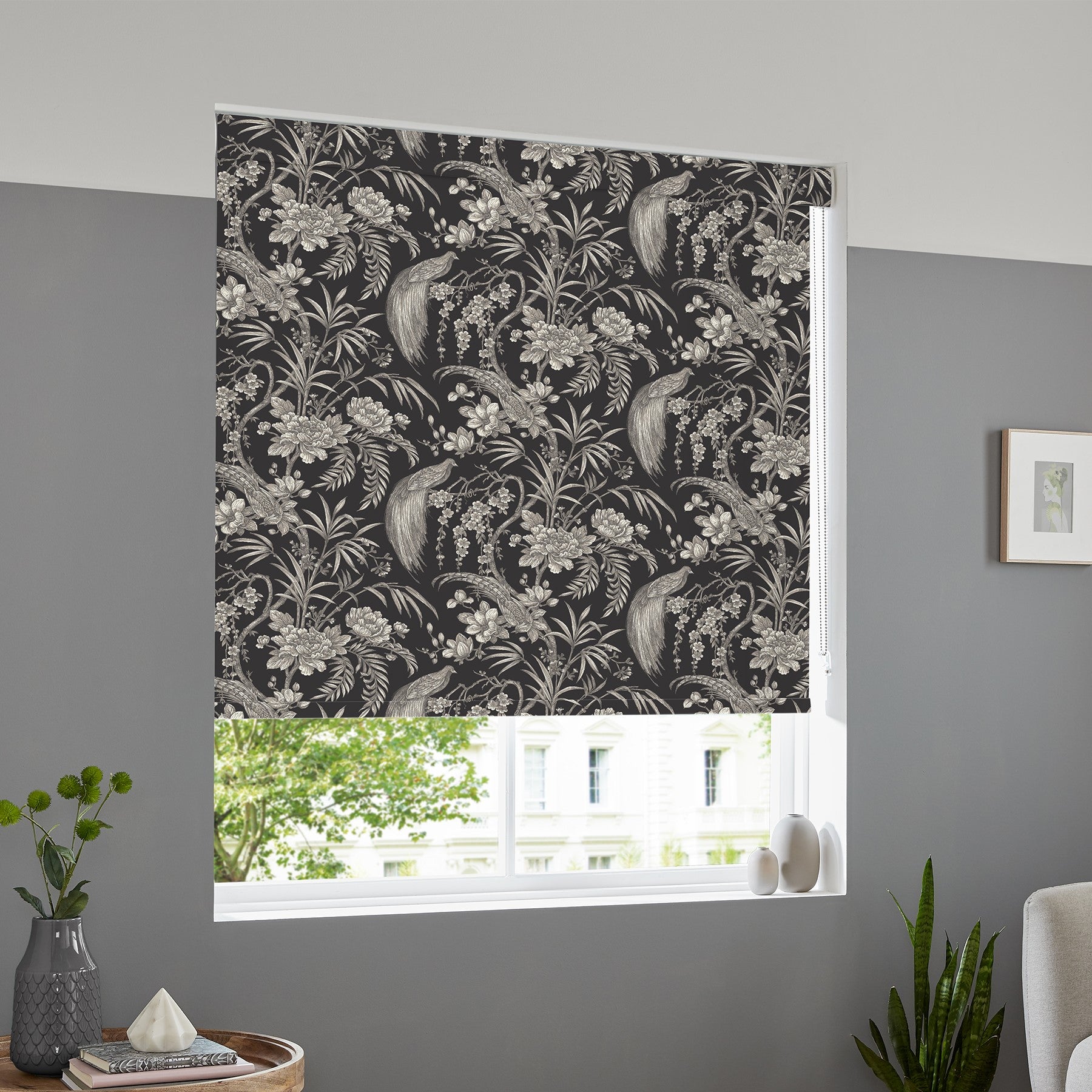 Experience the beauty of a bold black and white design with floral and bird elements against a deep ebony background. This blackout roller blind, made from high-quality polyester, will transform any space by effectively blocking out light.