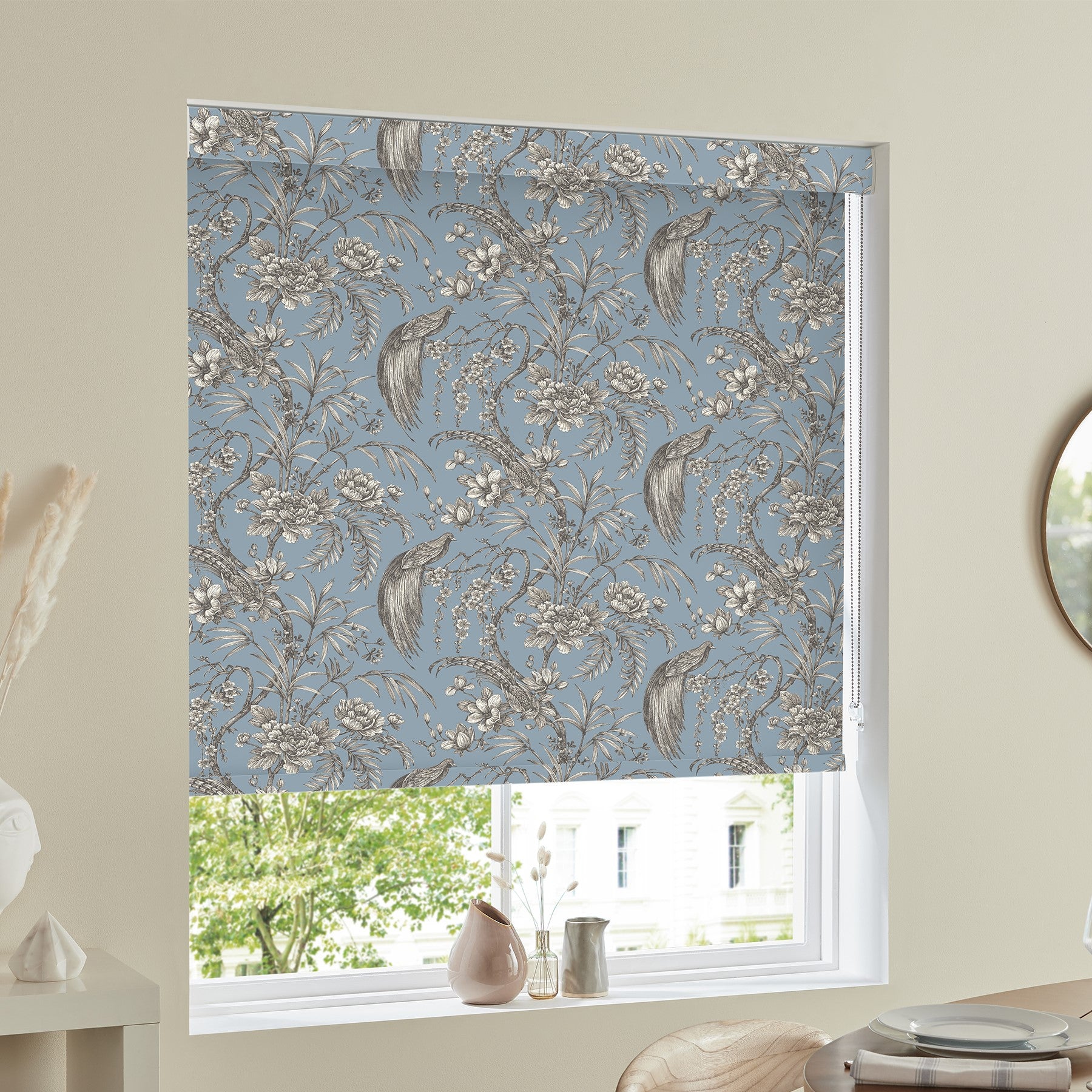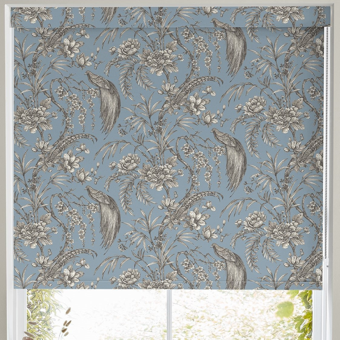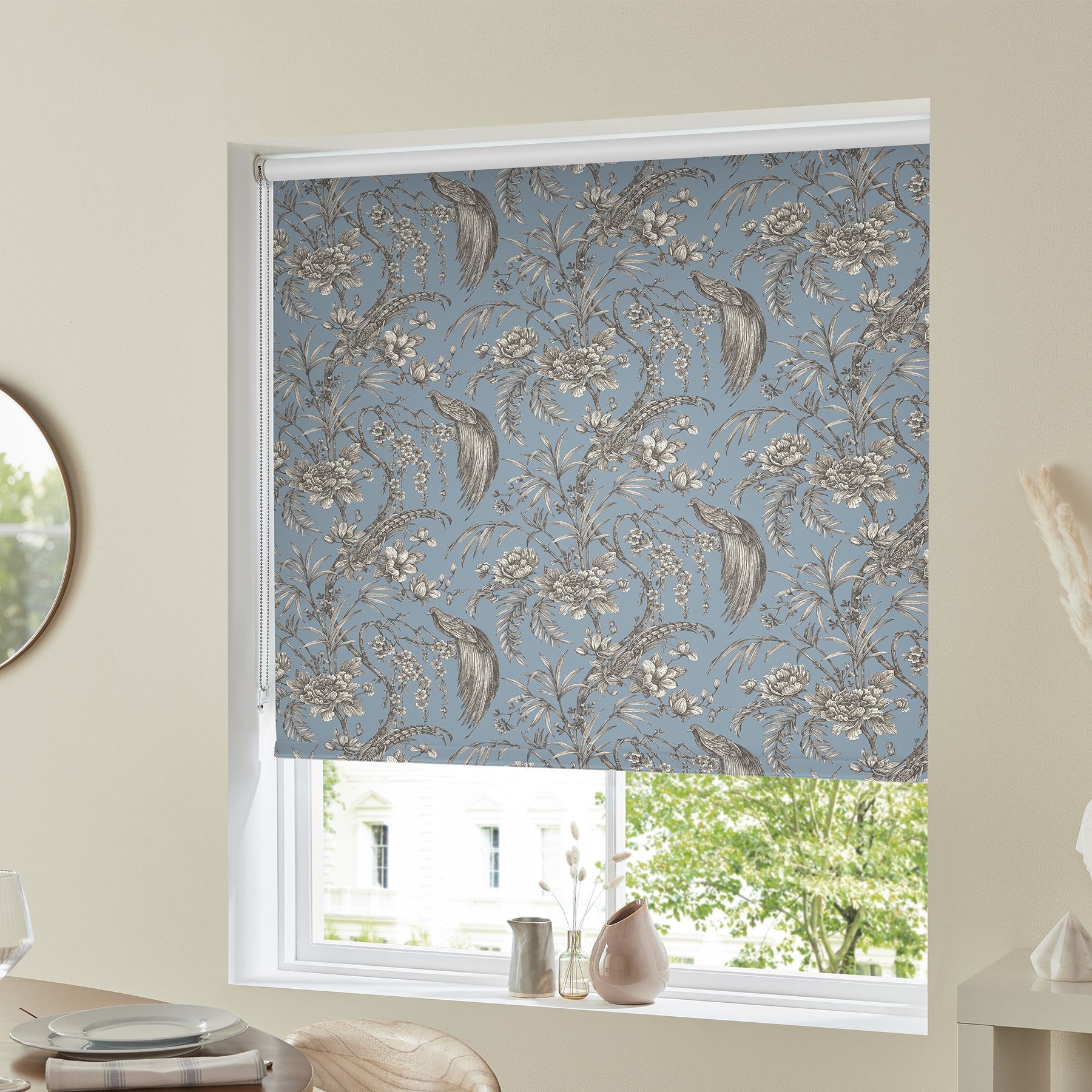 Experience the beauty of the Catalan Translucent Made To Measure Roller Blind in Sky, featuring a striking black and white floral and bird design set against a vibrant blue sky.