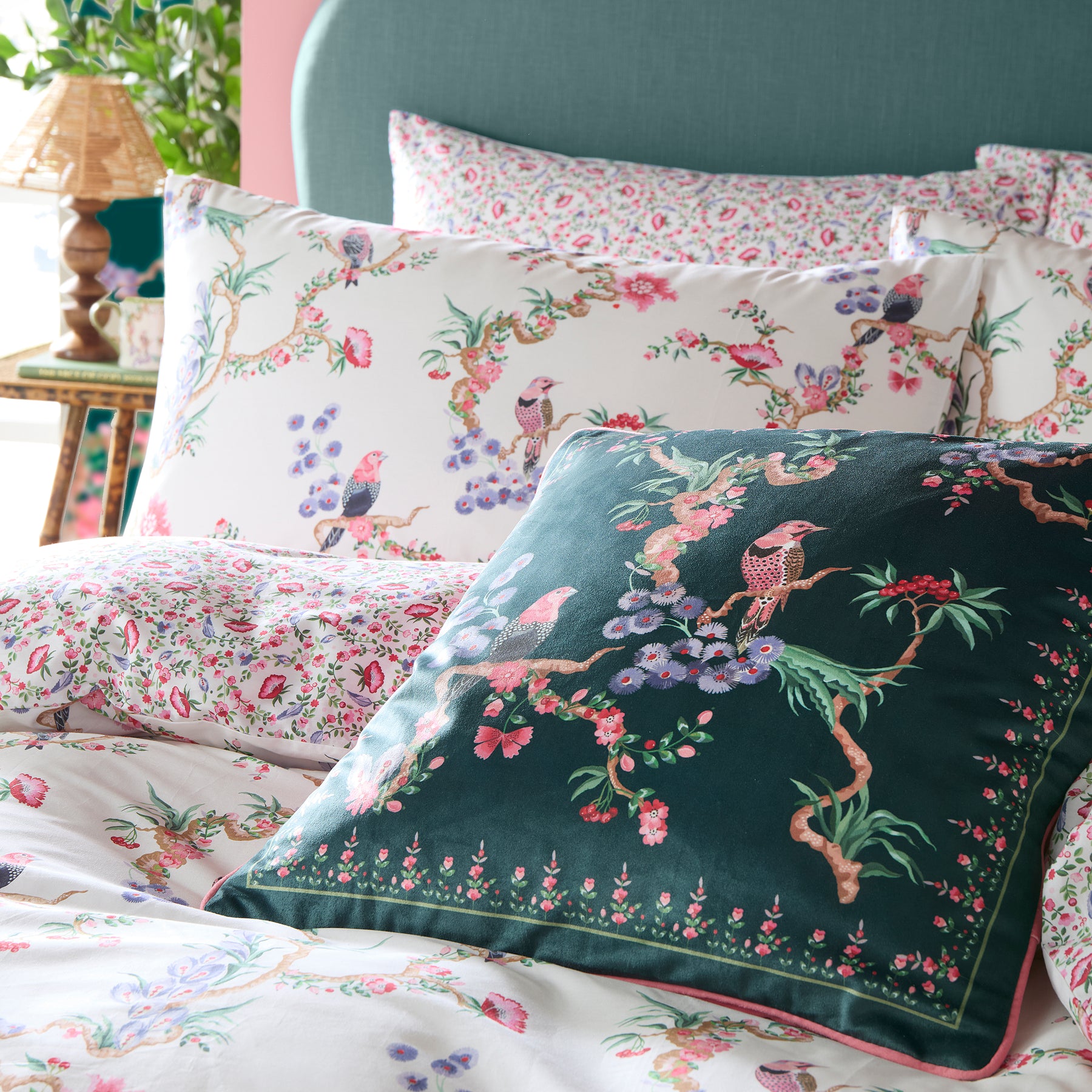 This brand-new hand-painted work of art features intricate branches, birds, and flowers in beautiful jewel tones. For 30 years, bird prints have been a beloved hallmark of Cath Kidston heritage. The cushion is printed on luxurious velvet with a deep emerald green background. The coral pink velvet piping and reverse add a touch of elegance, and it comes with a poly-filled pad.