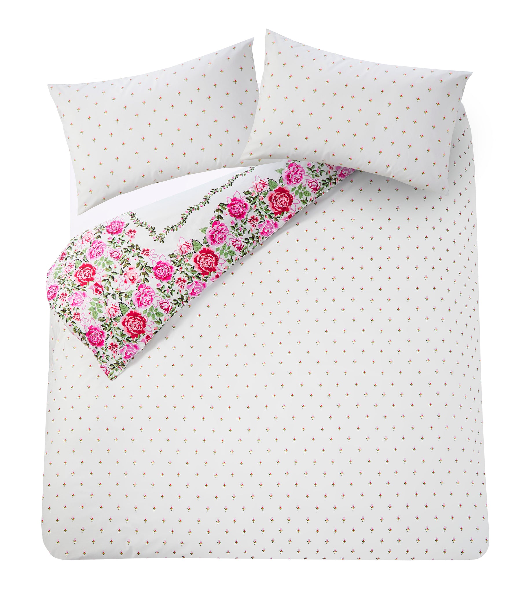 Created with inspiration from the Cath Kidston Archive, the 'Dolly Rose' design features a hand painted bloom in lively shades of pink and red. Against a soothing sage background, a delicate trail of heritage rose buds adds a timeless touch. The design is printed on soft 100% cotton percale, with a ditsy bud reverse pattern.