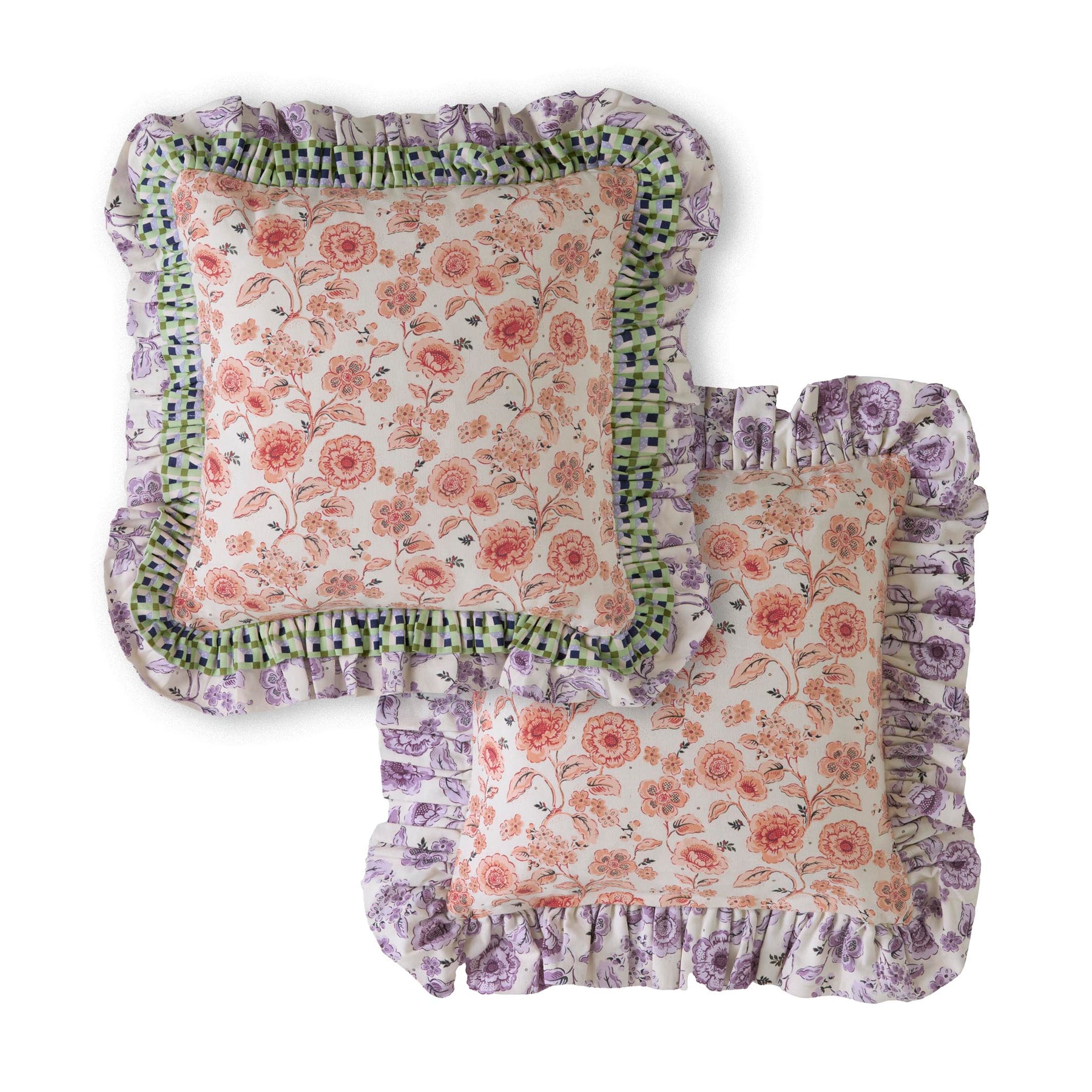This exquisite cushion features hand-painted flora, intricate wispy leaves, and delicate foliage in gentle hues of coral and orange. The addition of a dainty checked border in green tones creates a striking contrast, perfectly enhanced by a lilac floral ruffle edge for added dimension. Transform your home with this charming double ruffle cushion that brings a touch of joy and colour.