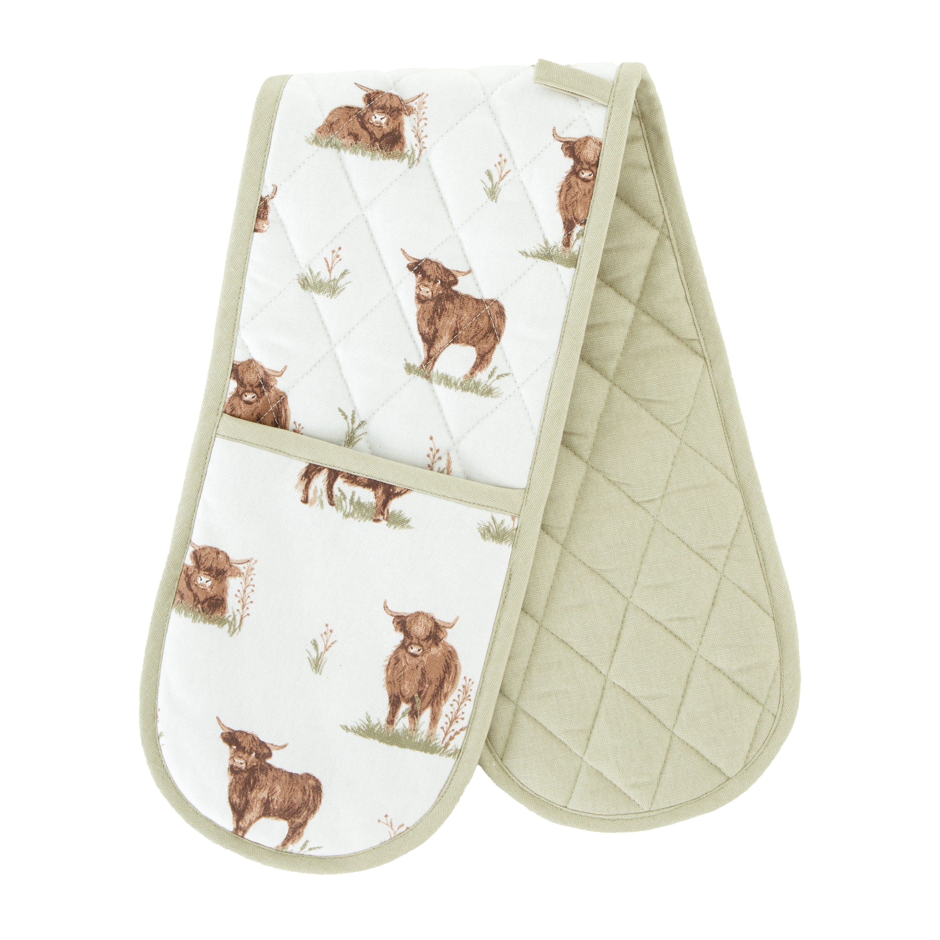 Add a touch of rustic appeal to your kitchen with this elegant oven glove showcasing a Highland cow motif in various stances. Made from durable, easy-care 100% cotton, it offers reliable protection and comfort when handling hot items. Ideal for daily use, this glove blends functional design with countryside-inspired style.