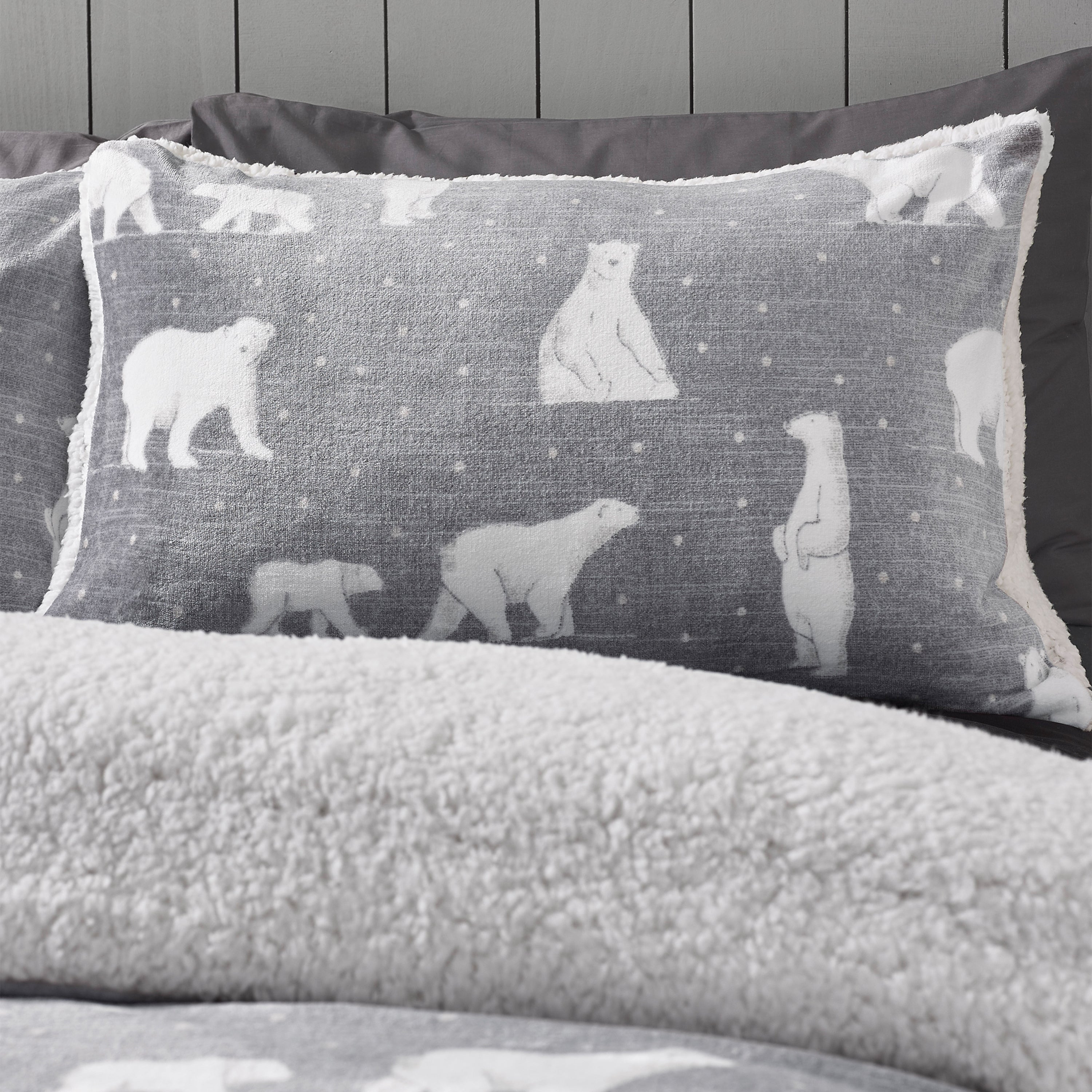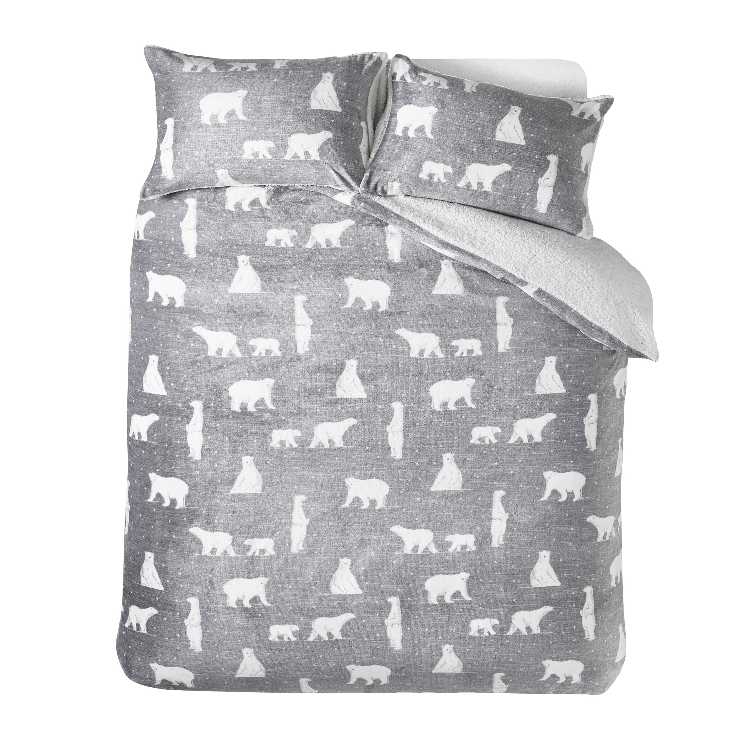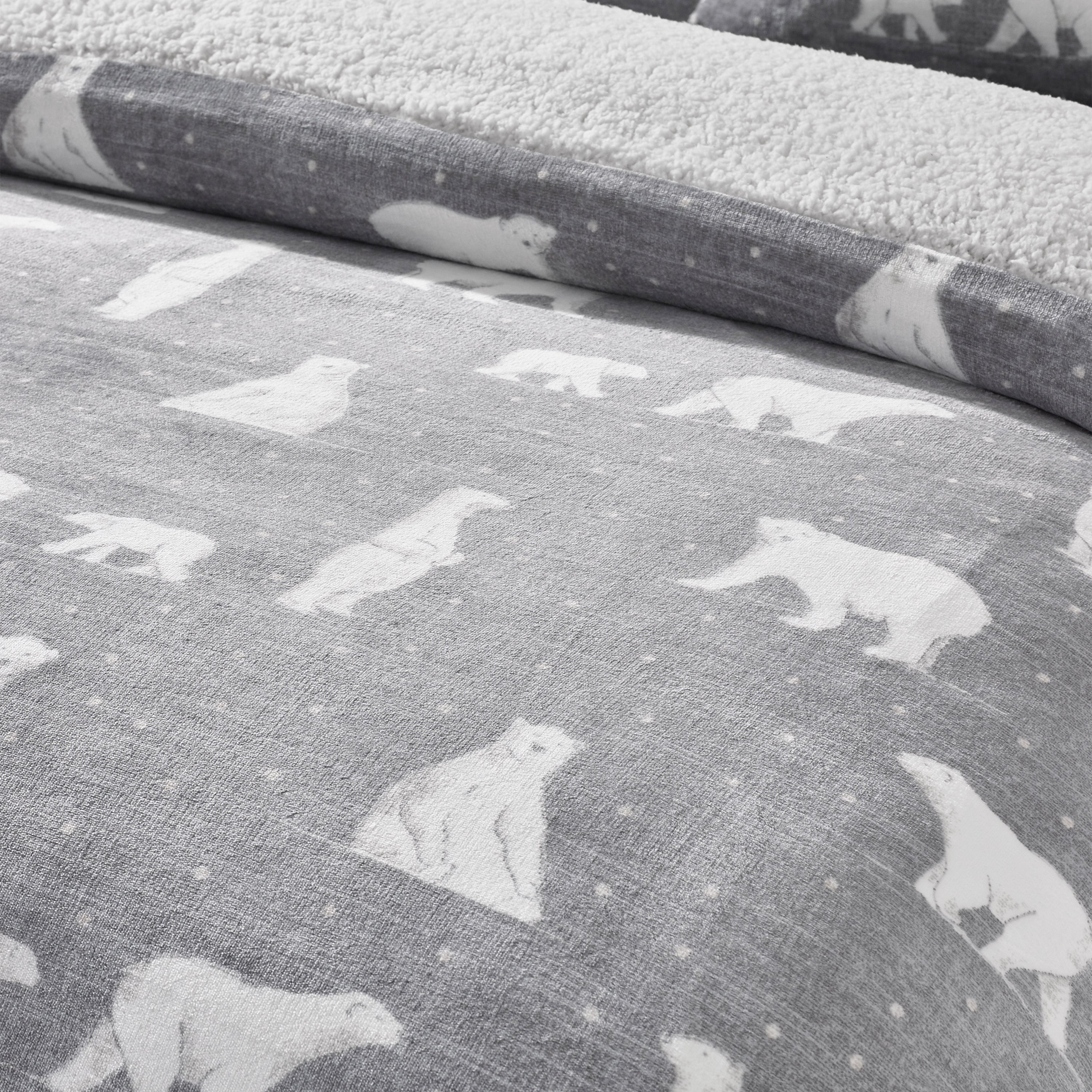 Experience the ultimate in warmth and comfort with the cosy polar bear bedding set, perfect for chilly nights. This set showcases an adorable polar bear motif against a soft grey backdrop, adding subtle Arctic elegance to your bedroom. The reverse side features luxurious Sherpa fabric, enhancing your space with a plush, welcoming texture ideal for the colder season.