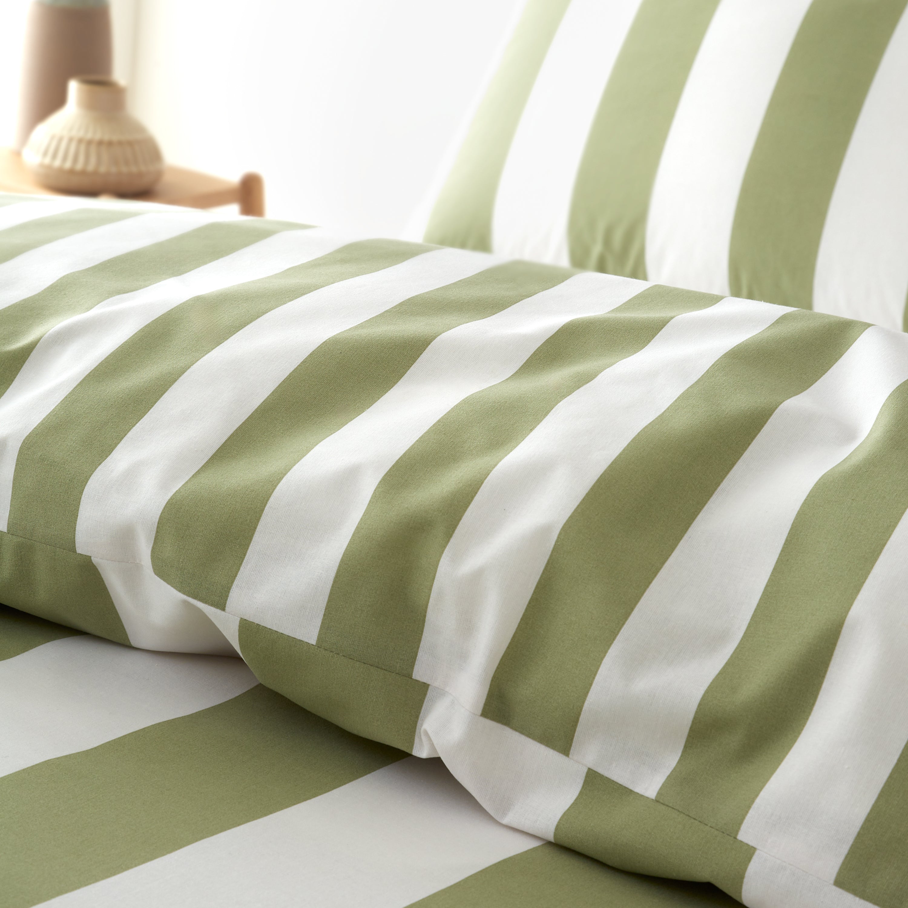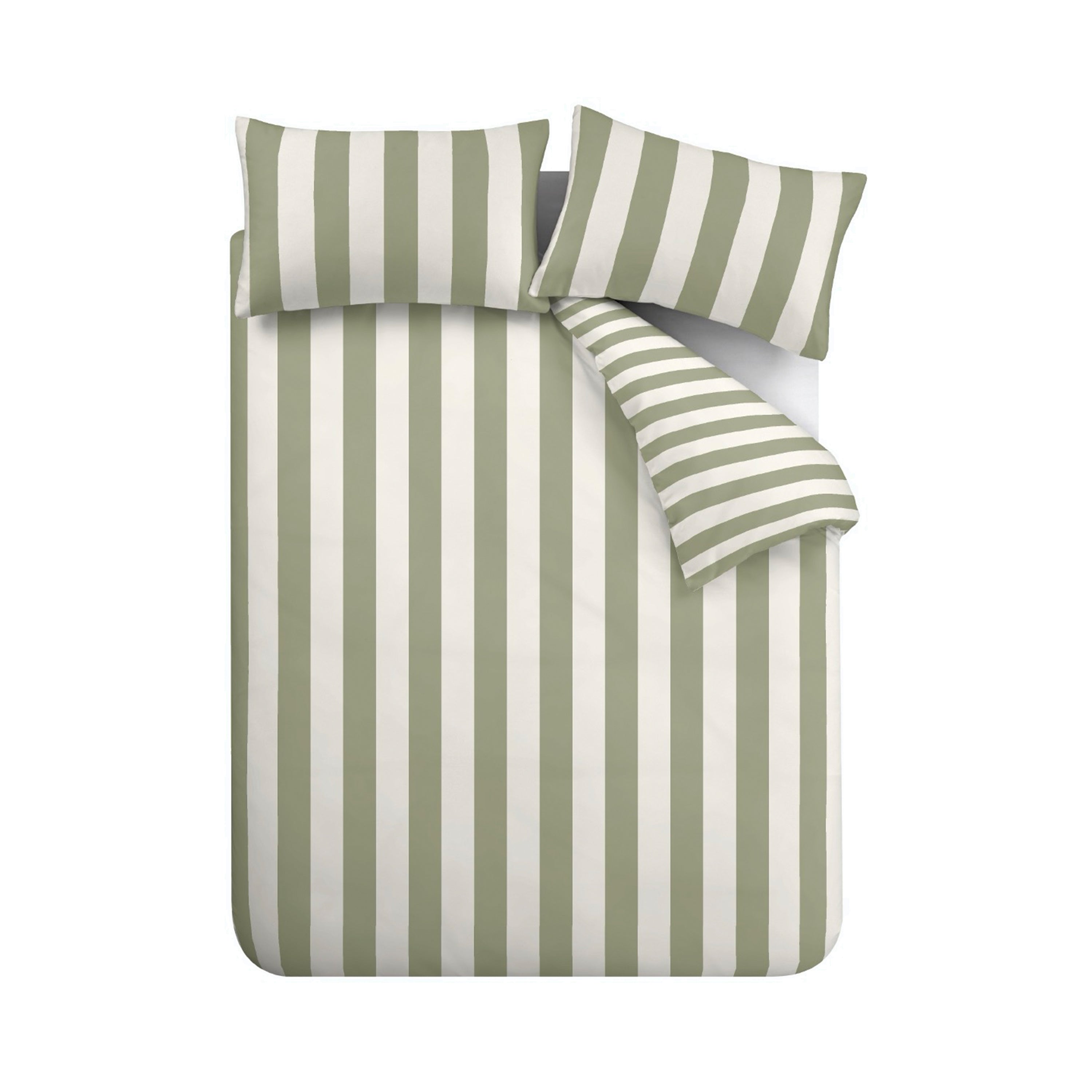 A contemporary twist on classic stripes, wide vertical bands in captivating contrasting neutral and green tones transform your bedroom into a serene oasis. Fully reversible with a simple small ribbon stripe, allowing you to effortlessly switch up your style in seconds. Created from easy-care recycled polyester and soft responsibly sourced cotton, blended together for everyday use. Catherine Lansfield is renowned for style and quality; she was designed and developed in Great Britain.