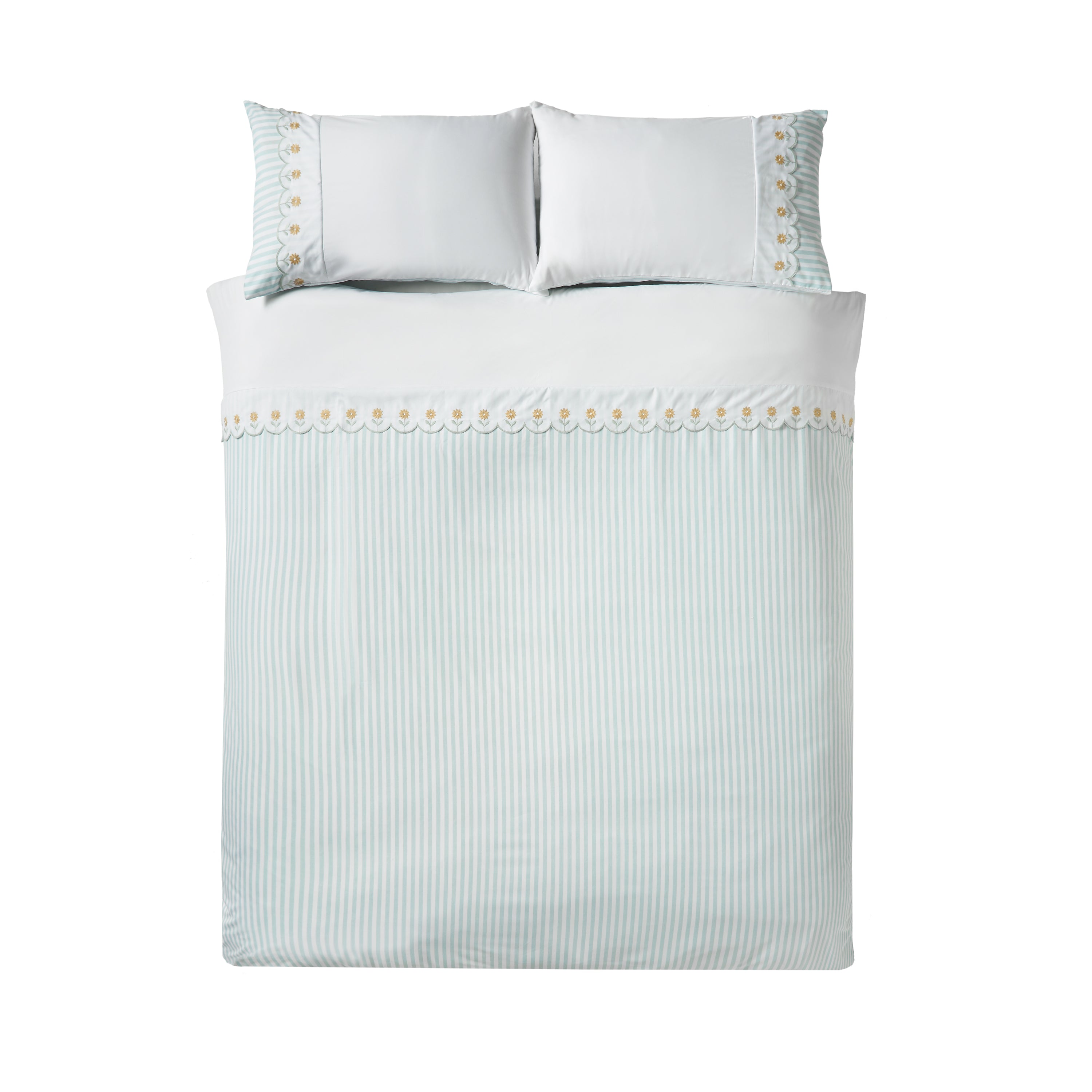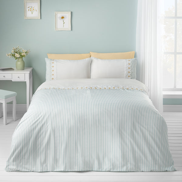Transform your bedroom with this sophisticated embroidered daisy bedding collection from Catherine Lansfield. The sage green palette is complemented by subtle pinstripes and elegant scalloped borders, whilst hand-stitched daisy motifs add contemporary countryside elegance. Crafted from durable microfibre, this set offers exceptional practicality—resisting wrinkles and drying rapidly for minimal maintenance. Each piece meets rigorous OEKO-TEX® STANDARD 100 certification, ensuring both safety and environmental responsibility. Designed and manufactured in Great Britain, this collection represents the brand's unwavering commitment to quality craftsmanship and timeless aesthetic appeal.