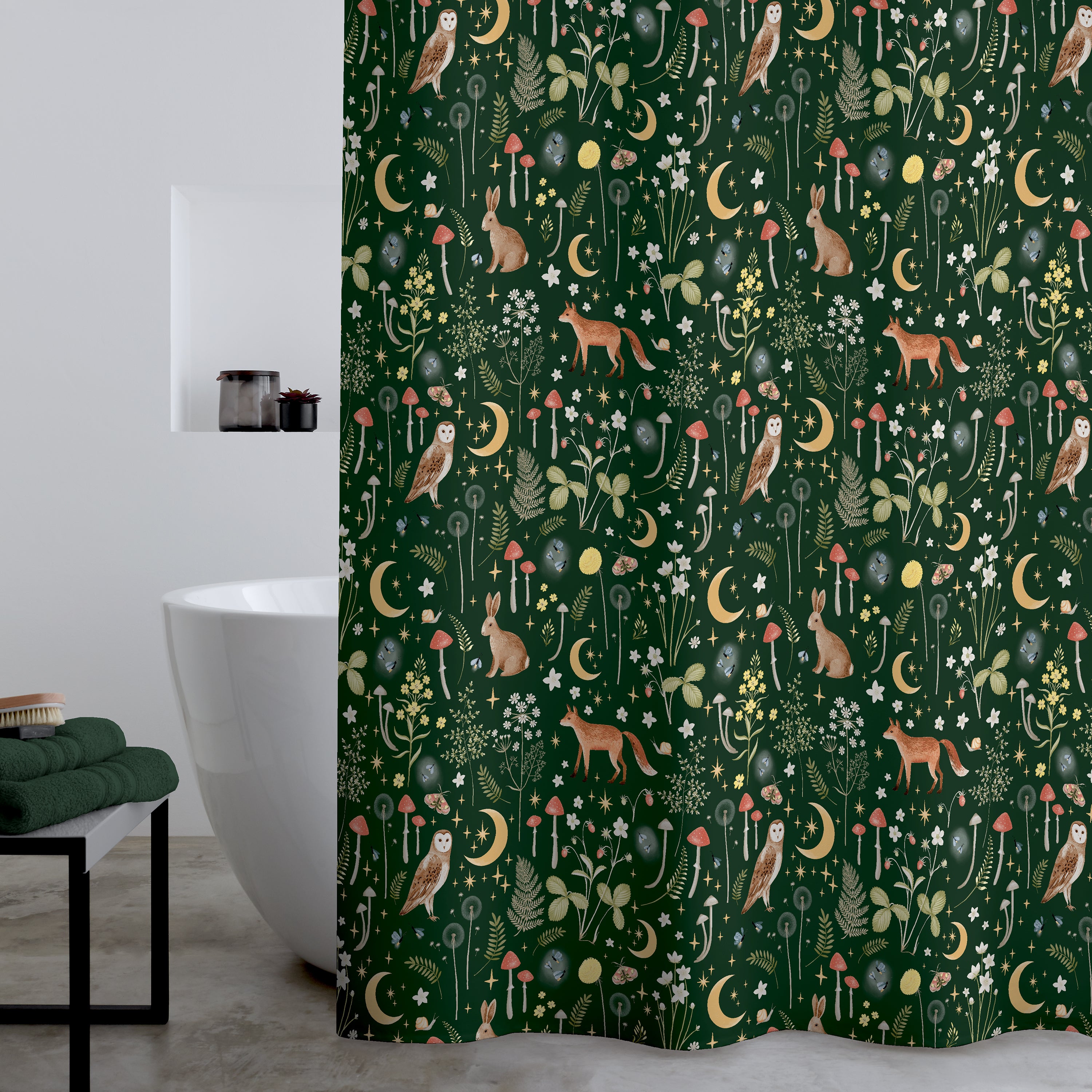 Transform your bathroom into a magical retreat with this folklore-inspired shower curtain. Showcasing detailed illustrations of foxes, owls, and rabbits, it brings a delightful touch of charm and whimsy to any space. Designed for lasting use, it features a water-resistant finish and a practical eyelet header for easy installation. Please note that hooks are not included with this curtain.