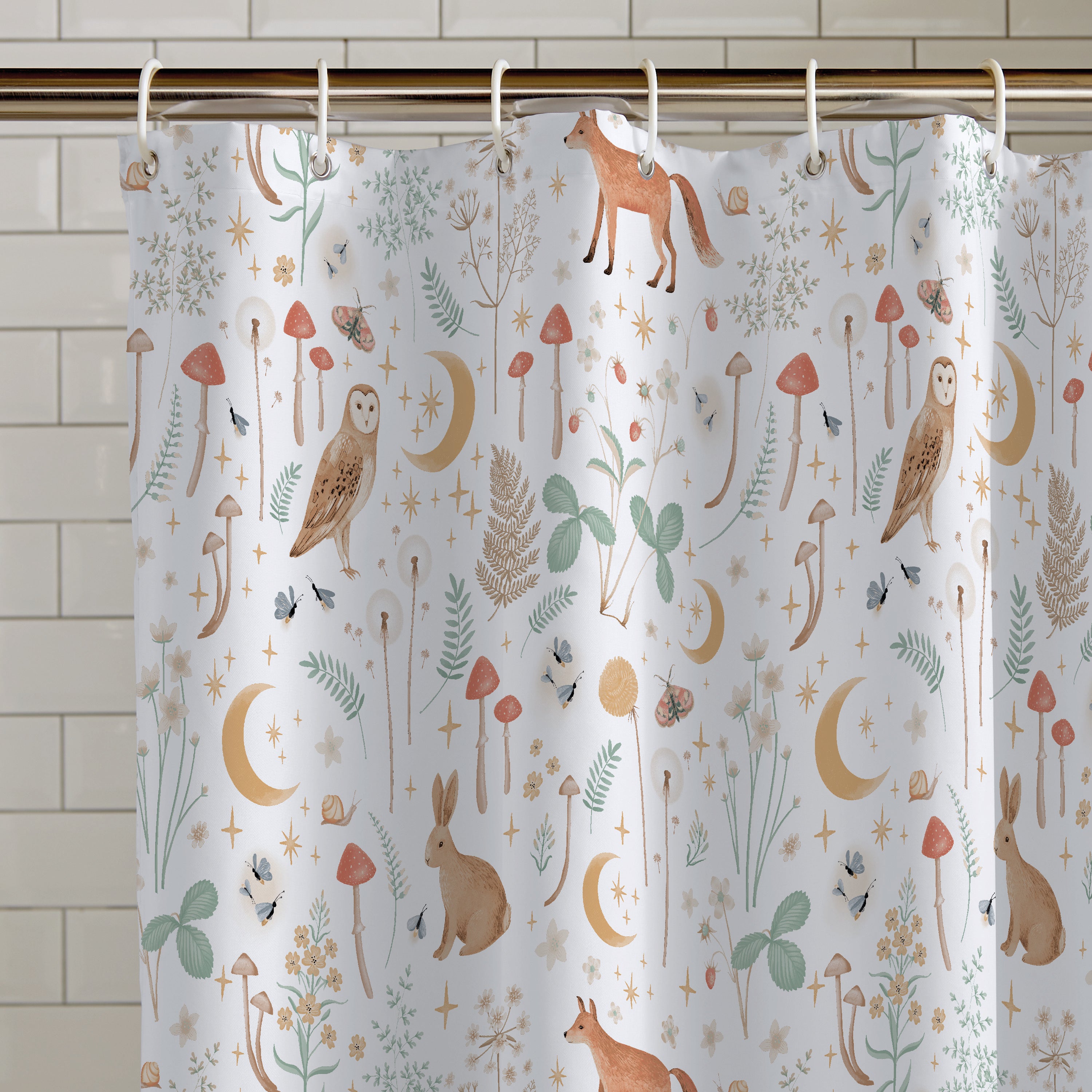 Bring a touch of magic to your bathroom with this folklore-inspired shower curtain. Decorated with charming illustrations of foxes, owls, and rabbits, it introduces a whimsical yet elegant atmosphere. Crafted for durability, it features a water-resistant finish and a convenient eyelet header for easy hanging. Note that hooks are not included with this product.