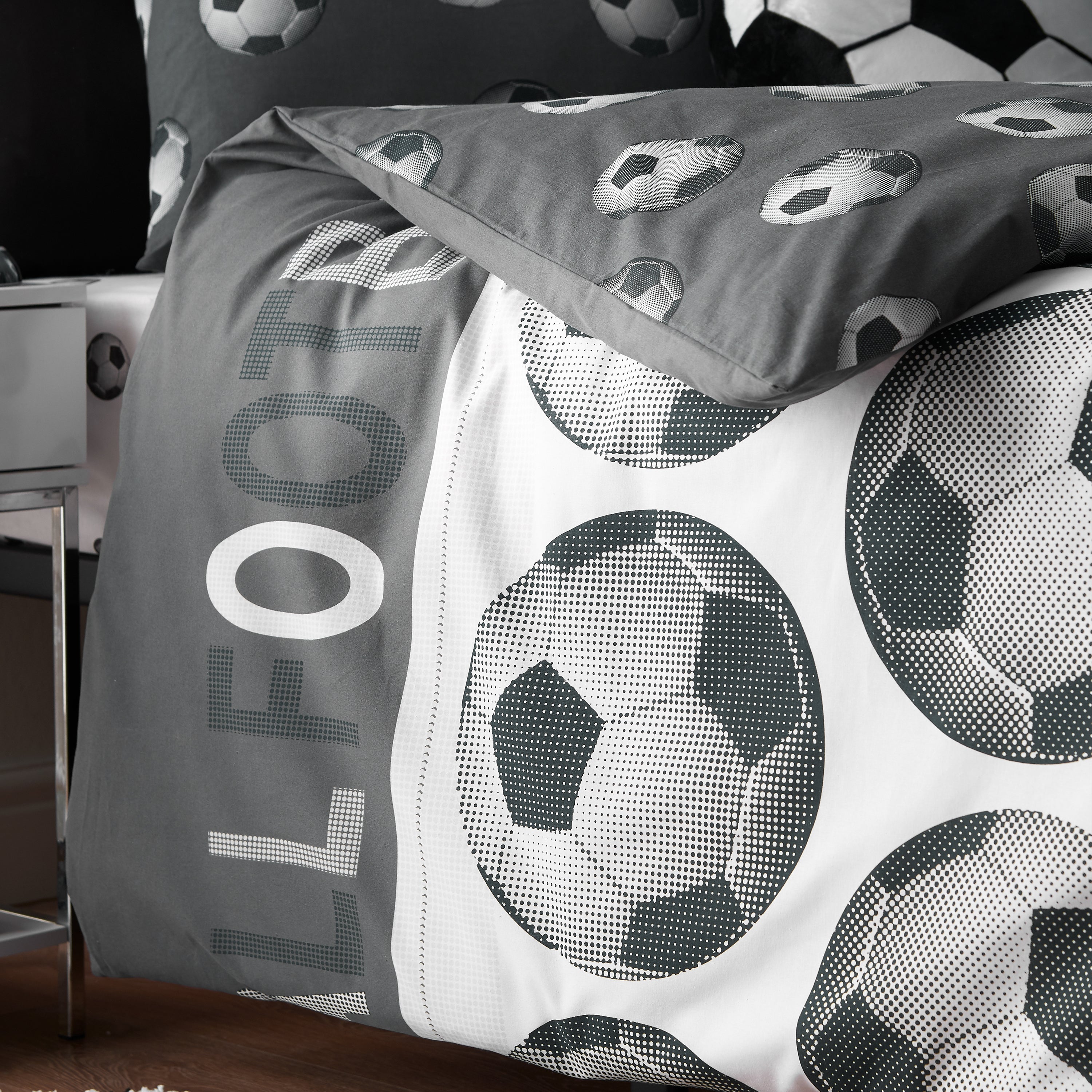 Transform your child's bedroom into a football fan's paradise with this Catherine Lansfield duvet set. Featuring striking printed football motifs throughout, it captures the excitement of the game in vibrant grey tones. The reversible design offers versatility, allowing you to refresh the look whenever desired. Crafted from a thoughtfully blended composition of recycled polyester and cotton, this bedding delivers both durability and comfort for daily use. Catherine Lansfield's British heritage ensures meticulous attention to quality and design excellence. Certified to MADE IN GREEN by OEKO-TEX® standards, it meets rigorous environmental and safety requirements, making it a responsible choice for your family's home.