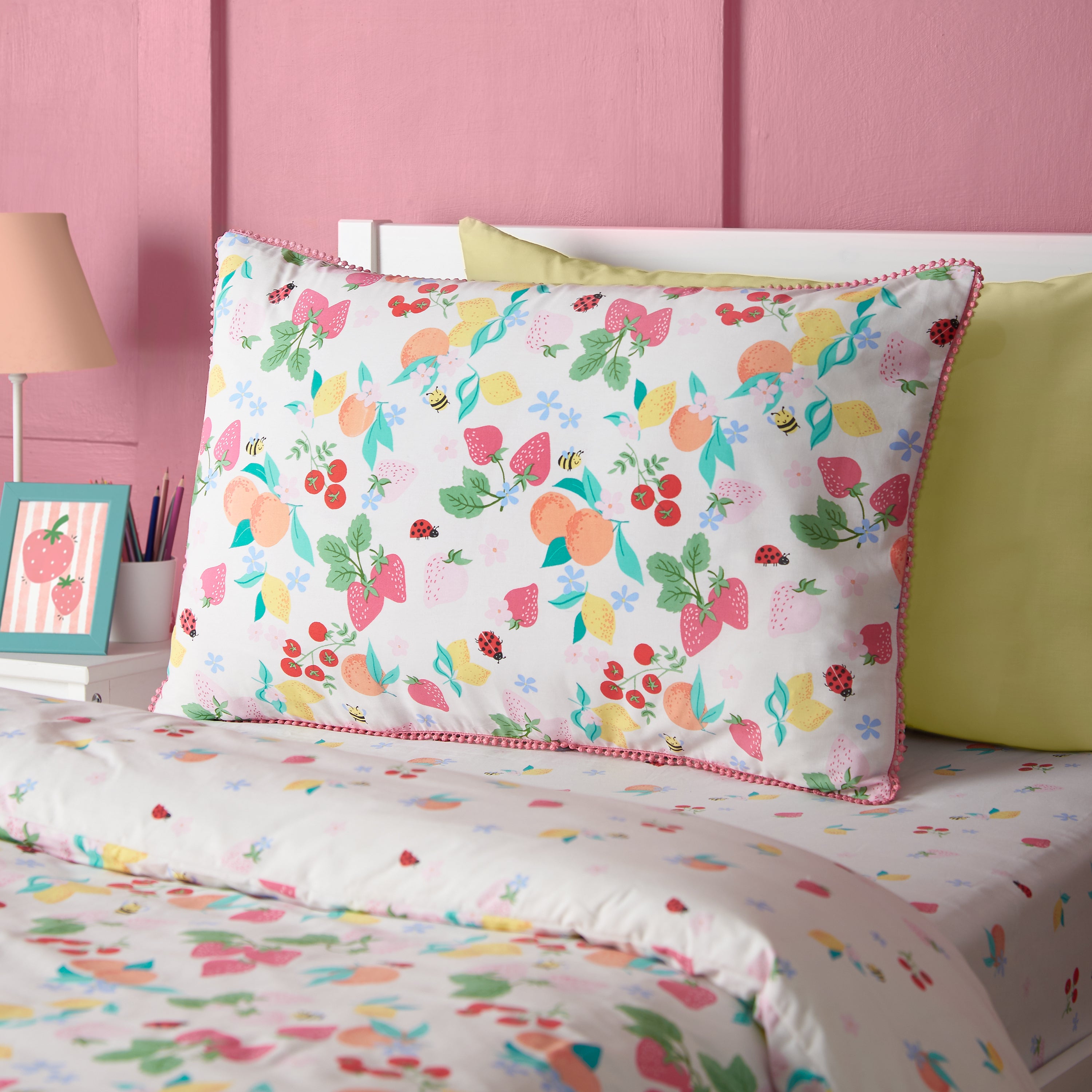 Transform your child's bedroom into a vibrant wonderland with this delightful bedding collection from Catherine Lansfield. Featuring an enchanting design of strawberries, oranges, and cherries accompanied by playful ladybirds and bees, this set captures imagination at every glance. The reverse side presents a serene alternative for versatile styling preferences. A distinctive pom pom trim adorns the pillowcase, adding a whimsical finishing touch. Crafted from a durable blend of recycled polyester and cotton, this bedlinen withstands regular washing whilst maintaining its softness. Manufactured to rigorous quality standards and certified MADE IN GREEN by OEKO-TEX®, it reflects Catherine Lansfield's commitment to both design excellence and responsible production practices.
