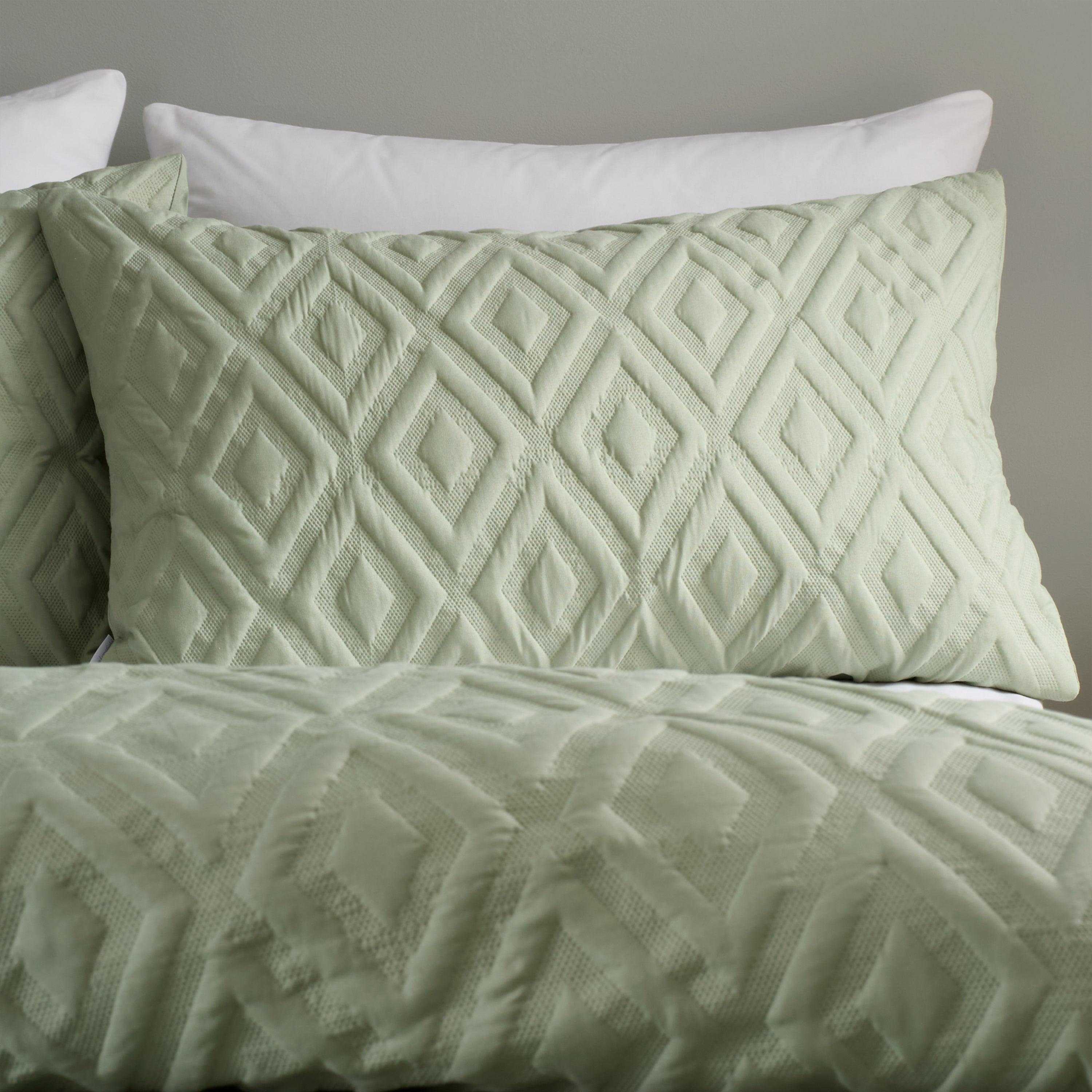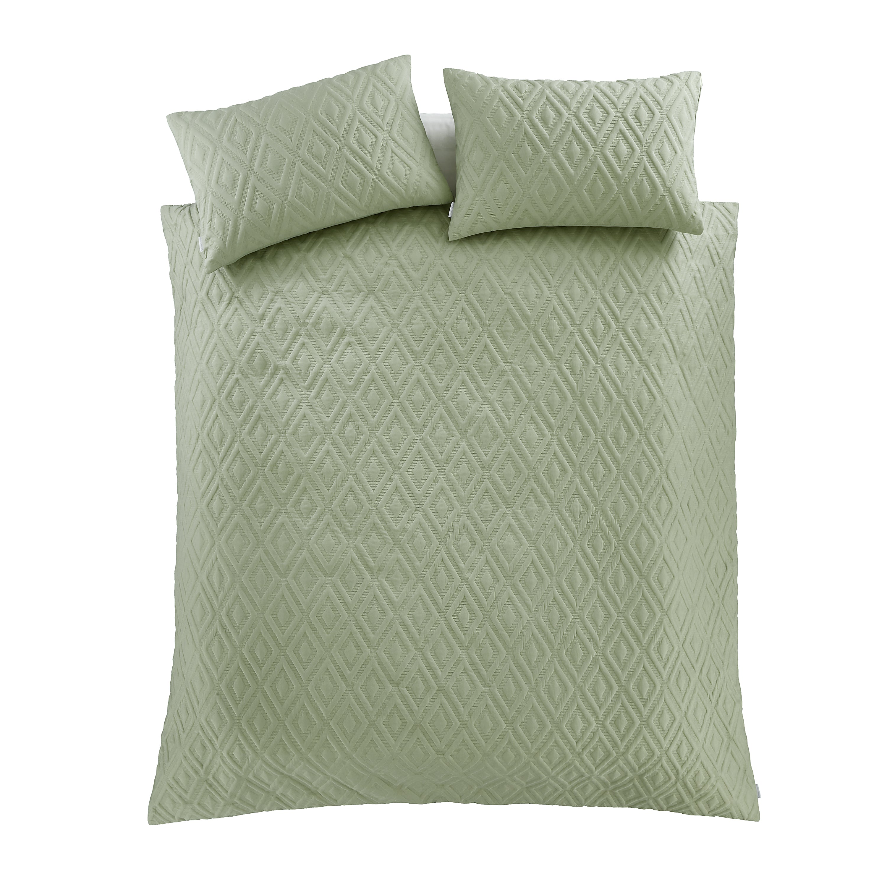 Transform your bedroom with the Catherine Lansfield Jacob Geo Duvet Cover Set in calming sage. This expertly crafted bedding features an intricate geometric pattern enhanced by innovative Pinsonic technology, which creates a distinctive textured finish that elevates the visual appeal of your sleep sanctuary. The raised surface detail adds tactile interest whilst maintaining the refined aesthetic that discerning homeowners demand. Designed and developed in Great Britain, this collection reflects Catherine Lansfield's commitment to marrying contemporary design with exceptional quality and lasting comfort.