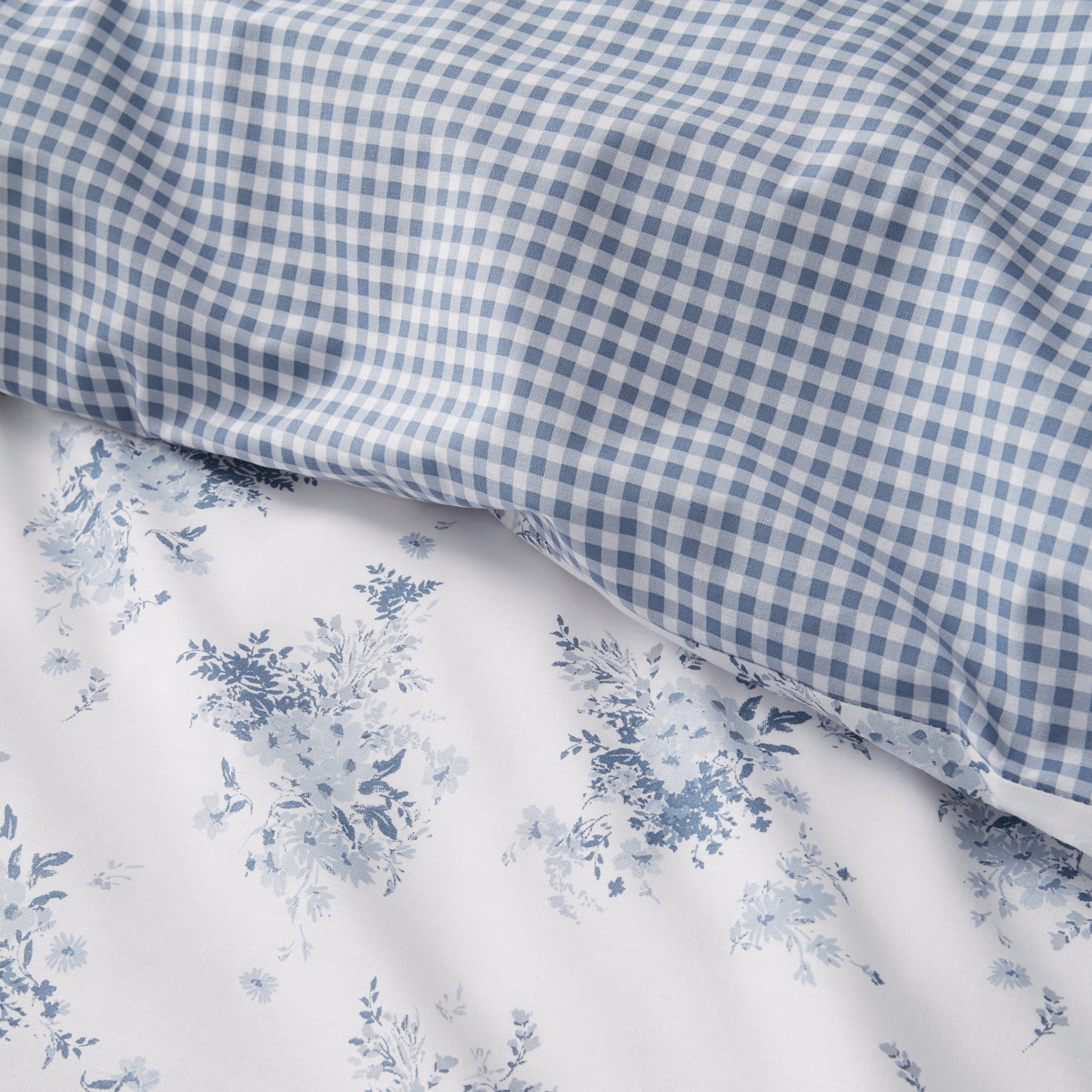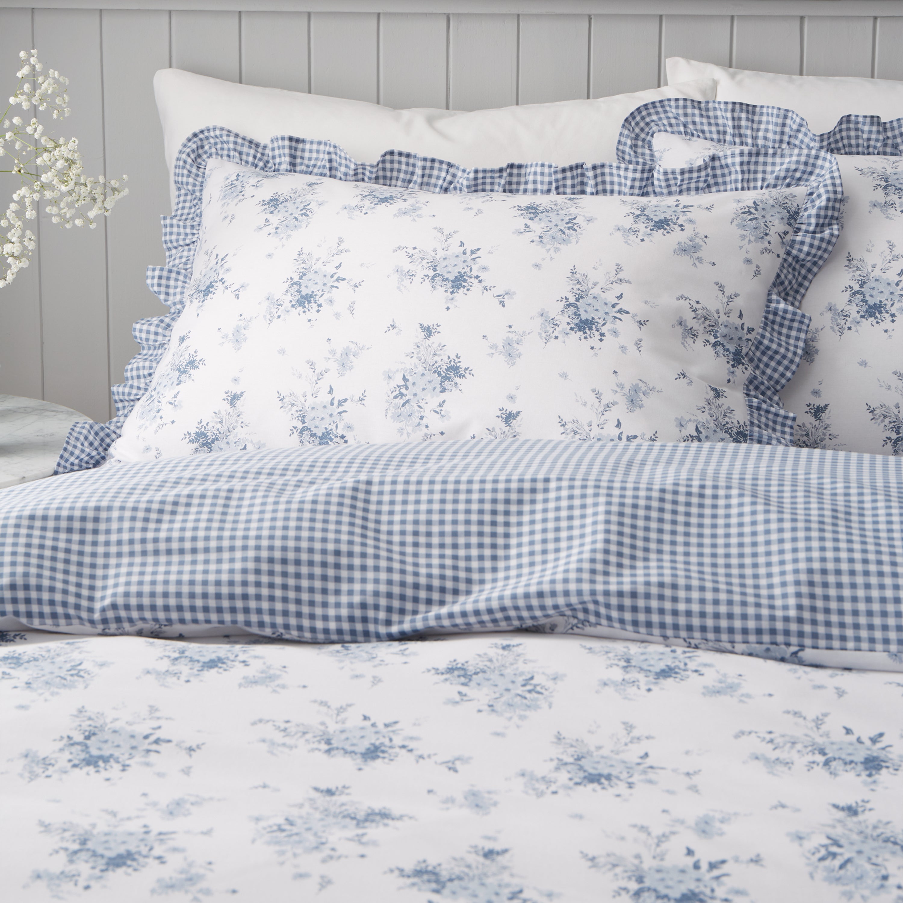 Experience the charm of the countryside in your master bedroom with this lovely bedding set featuring a delicate blue floral design and frilled edges. The set is fully reversible, with a blue gingham pattern for added versatility. Made from a blend of easy-care recycled polyester and soft cotton, it is perfect for everyday use. Catherine Lansfield, known for their style and quality, designed and produced this set in Great Britain.