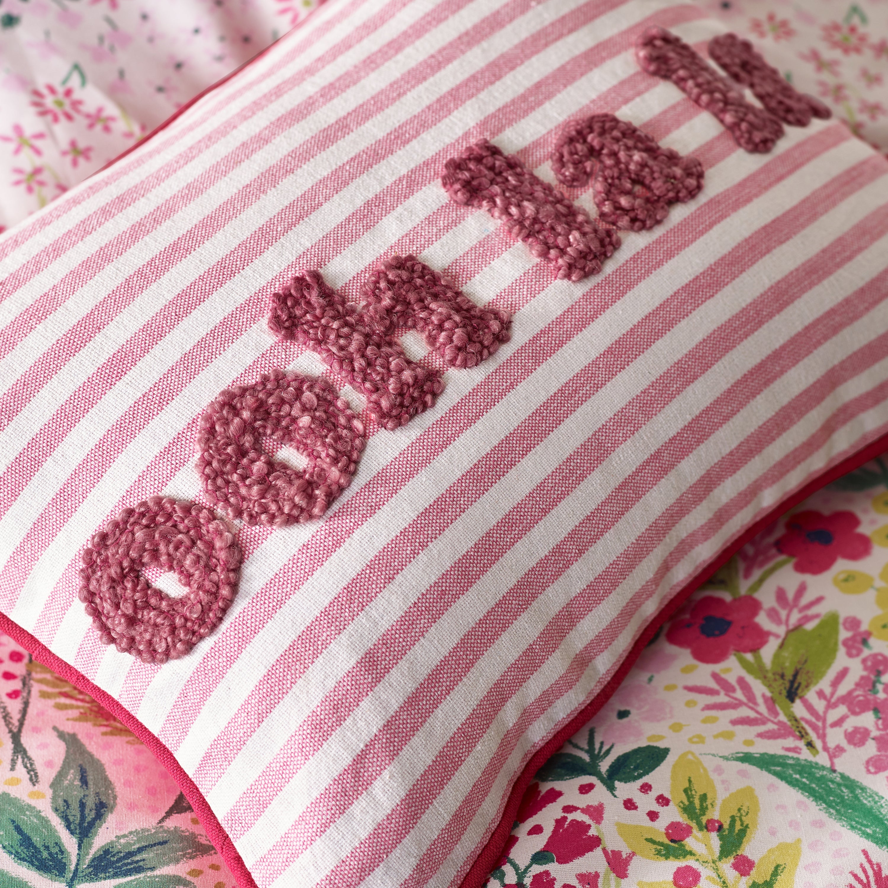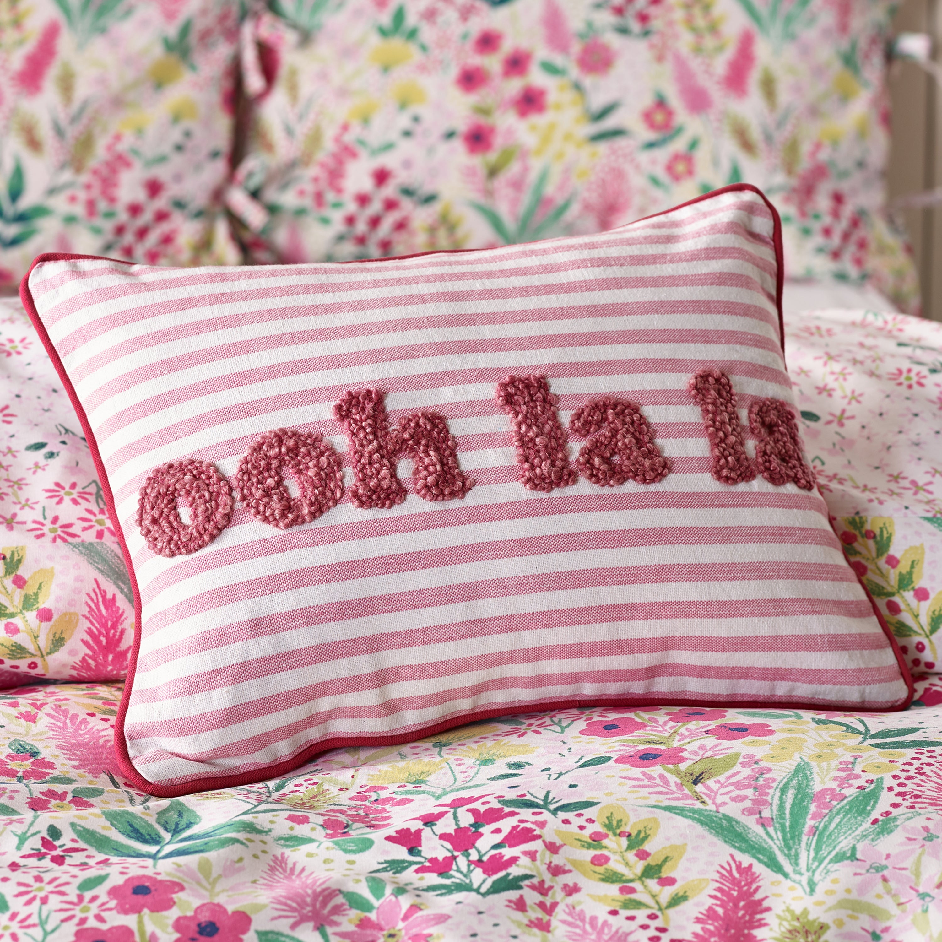 Elevate your interior with this sophisticated scatter cushion from Catherine Lansfield, showcasing a witty "Ohh La La" motif in plush tufted lettering against refined striped detailing. The striking design merges contemporary style with playful charm, making it an ideal accent piece for any room. Crafted in Great Britain, this cushion meets rigorous quality and safety standards and is certified to STANDARD 100 by OEKO-TEX®. Catherine Lansfield's commitment to excellence ensures both aesthetic appeal and lasting durability in every piece.