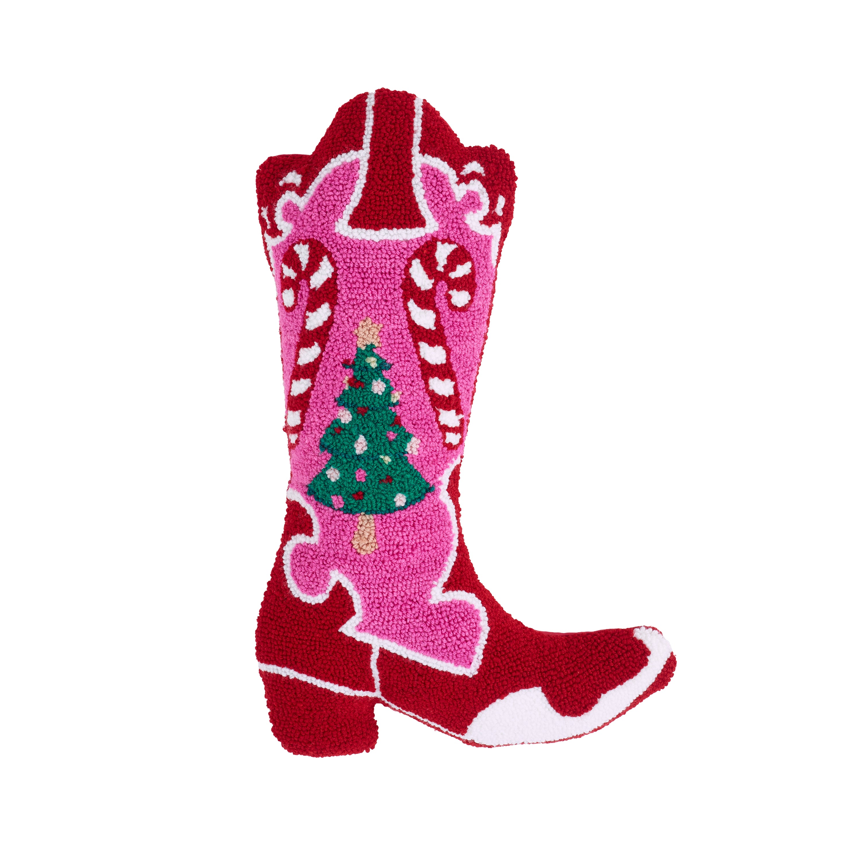 Bring a Wild Western vibe to your holiday decorations with the Santa’s Howdy Christmas cushion. Designed in the shape of a traditional cowboy boot, this distinctive cushion features a Christmas tree encircled by candy canes, combining festive cheer with rodeo style. It’s an exceptional and charming piece to enhance your seasonal décor with a touch of country flair. Trims are 100% acrylic.