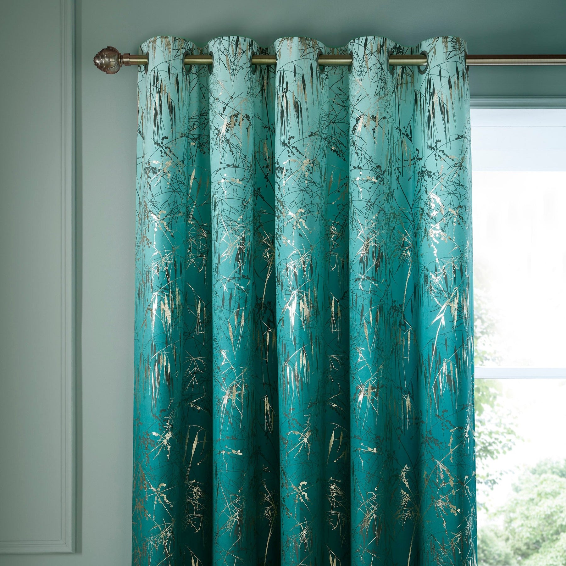 This signature design by Clarissa Hulse features an elegant Teal Ombre background adorned with gracefully arcing meadow grasses. The inspiration for this design came from an evening spent photographing grasses, resulting in a stunning look complete with gold foil details and a soft-touch velvet texture. These curtains are the perfect addition to any elegant and vibrant bedroom, sitting-room, or study. This beloved design has been featured on various products, including cushions, wallpaper, fabrics, and a bedspread, and is now available in three different sizes as a luxurious set of curtains. These curtains are also lined and feature matte silver eyelets for a sleek and modern appearance.