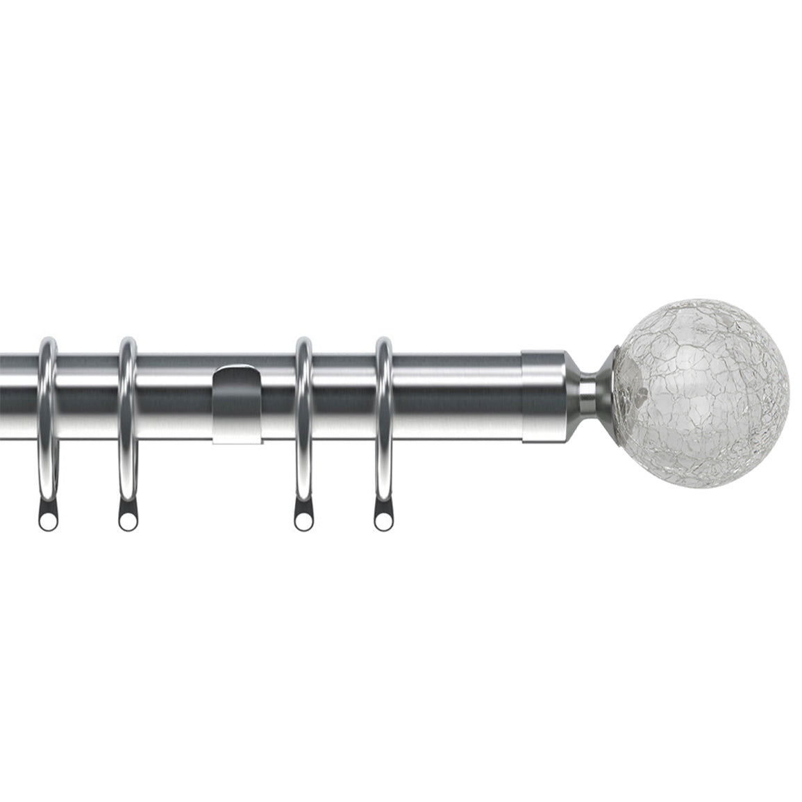 The satin silver finish of this pole is best described as a brushed steel finish, which is a polished finish making it a good choice for eyelet curtains, as there is no painted finish for eyelets to scratch. A stylish modern Satin Silver curtain pole with a clear cracked glass effect finial. Matching holdbacks are also available with this pole it gives a very striking and modern effect.