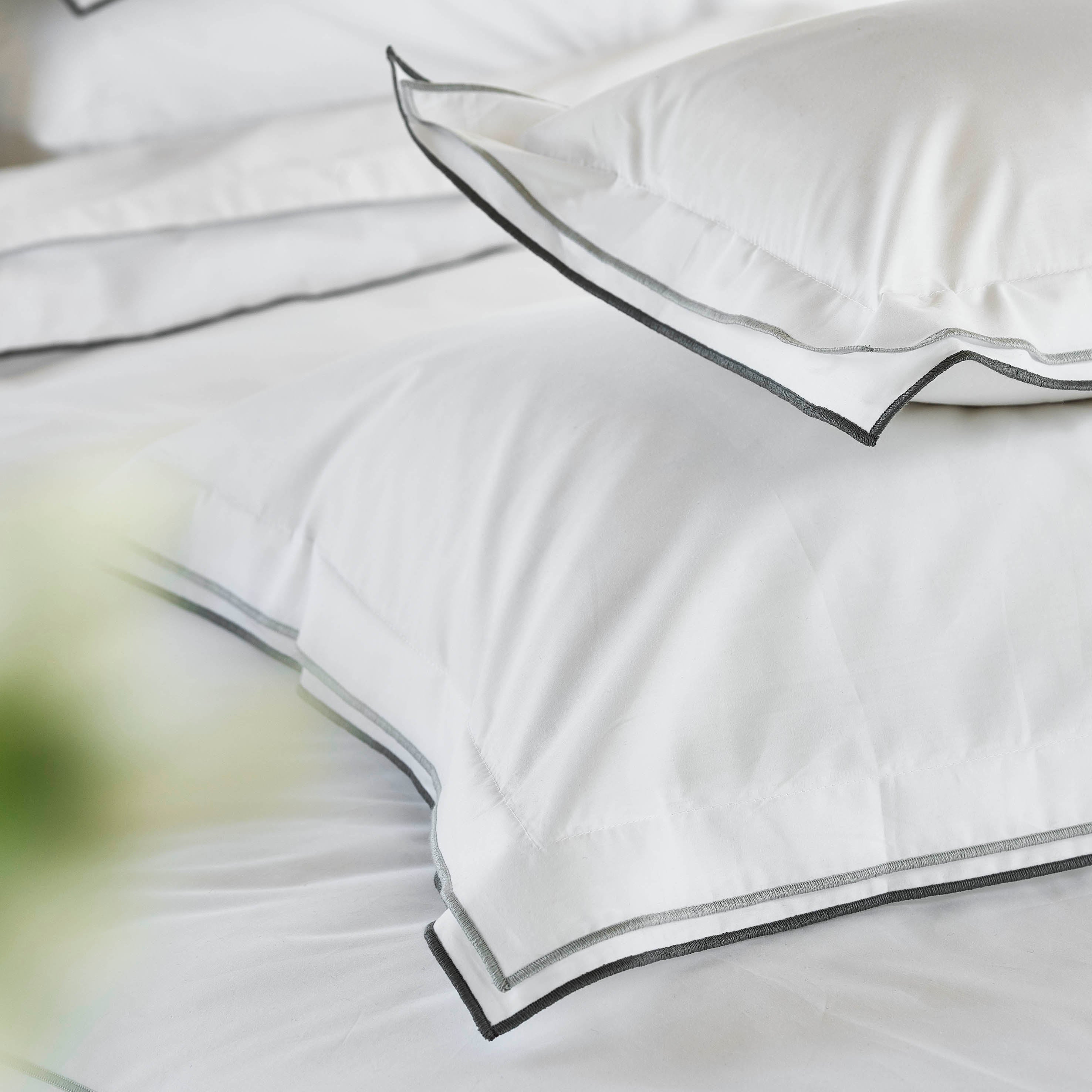 Elevate your bedroom with this premium 400 thread count cotton percale bedding collection from Designers Guild. Crafted to hotel standards, the set showcases refined embroidered detailing across the duvet cover and Oxford pillowcases in complementary silver slate tones. The sophisticated frame design and decorative edging deliver understated luxury, whilst the crisp percale weave ensures lasting comfort and durability. A discerning choice for those seeking quality linens with timeless elegance.