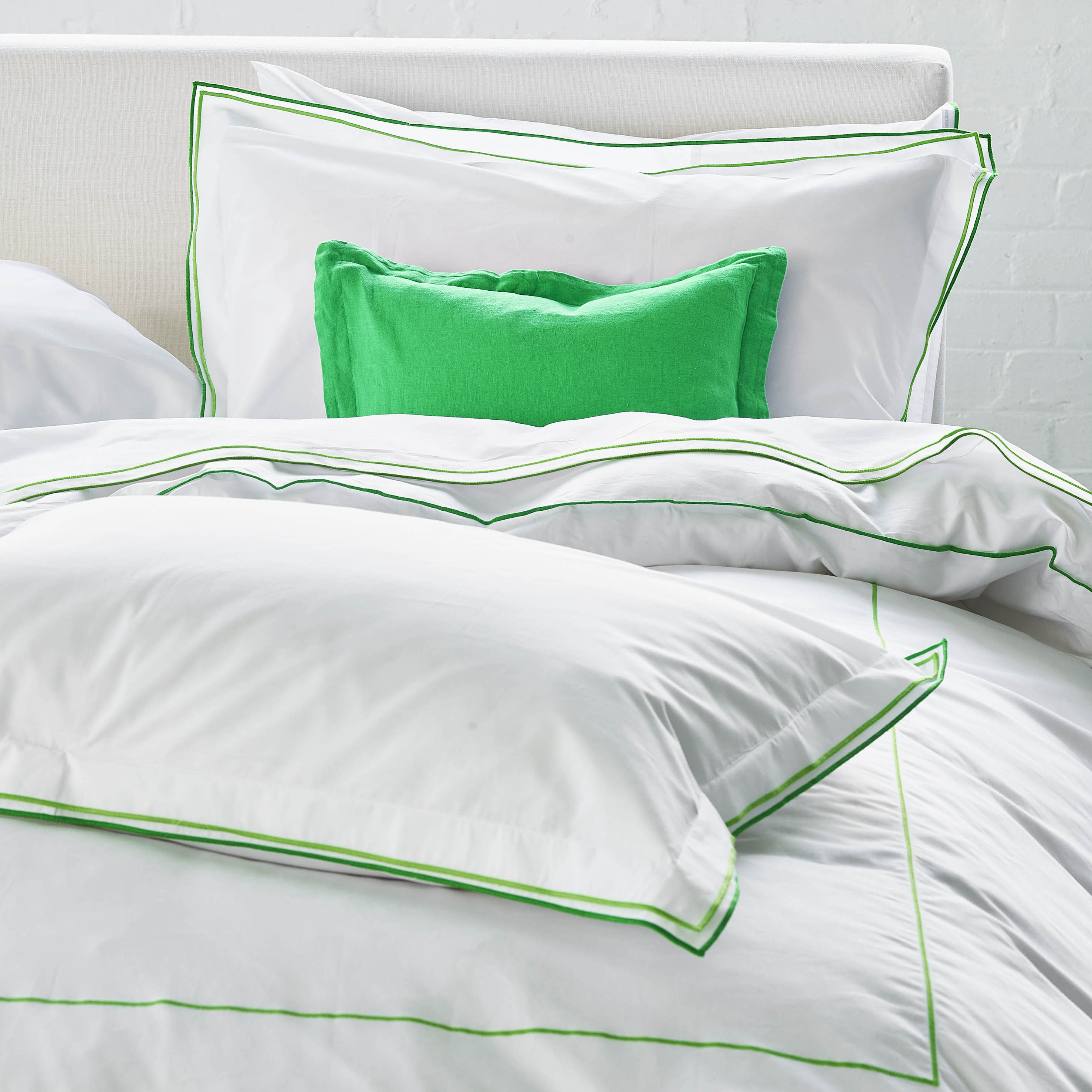 Crafted from premium 400 thread count cotton percale, these Designers Guild Oxford pillowcases deliver the refined comfort found in distinguished hotels. The emerald green fabric is elevated by intricate embroidered detailing in complementary tones along the double-edged borders, creating understated sophistication. Paired with coordinating duvet covers featuring embroidered frame designs and finished edges, this collection brings curated elegance to your sleeping space.