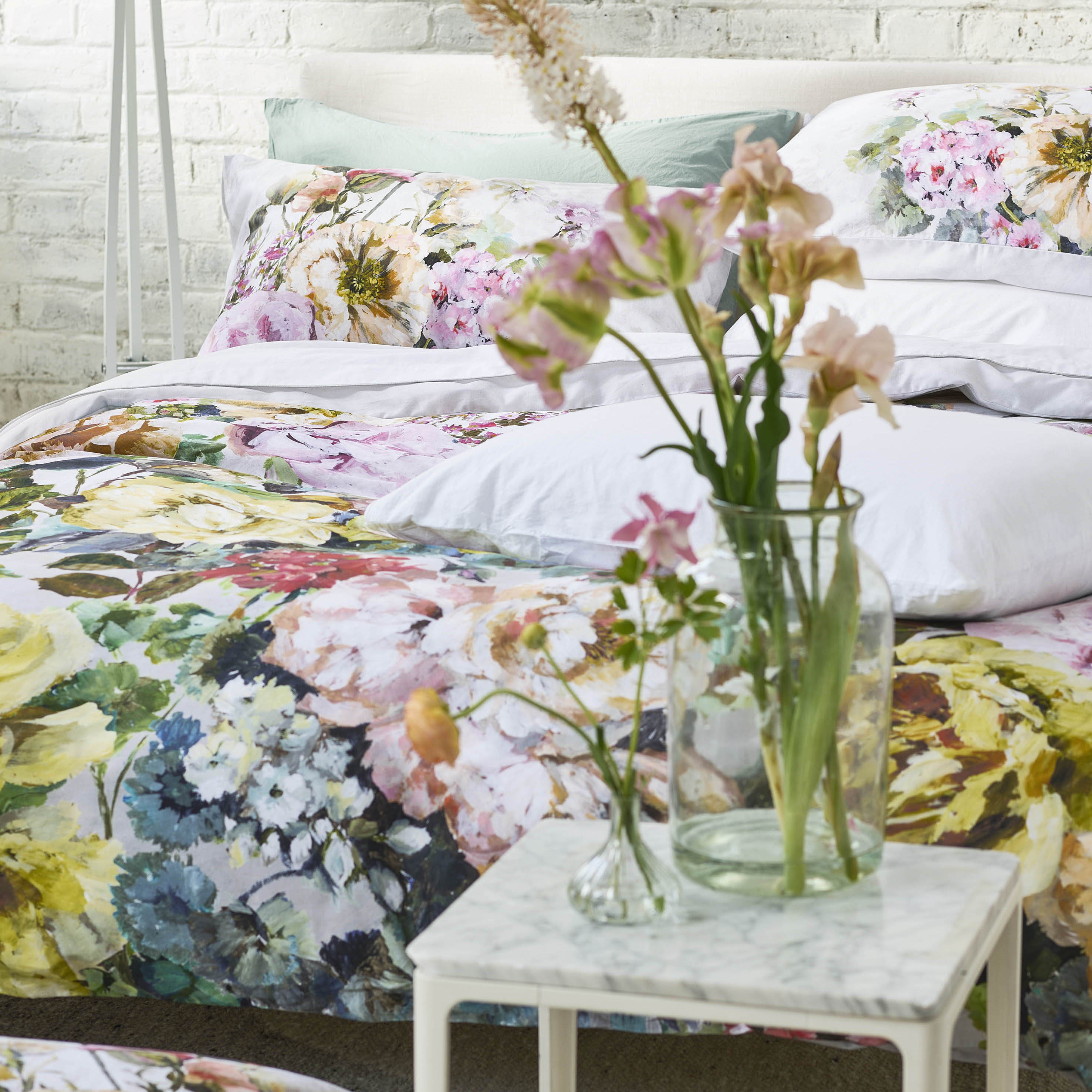 Transform your bedroom with this exquisite floral bedding collection from Designers Guild. Featuring an enchanting spring-inspired pattern rendered through advanced digital printing on premium 250 thread count cotton sateen, this duvet cover delivers sophisticated comfort and visual elegance. The reverse showcases a refined painterly finish, while an artisan-crafted coconut shell button provides an authentic, sustainable accent. Ideal for those seeking refined textiles that combine aesthetic appeal with tactile quality.