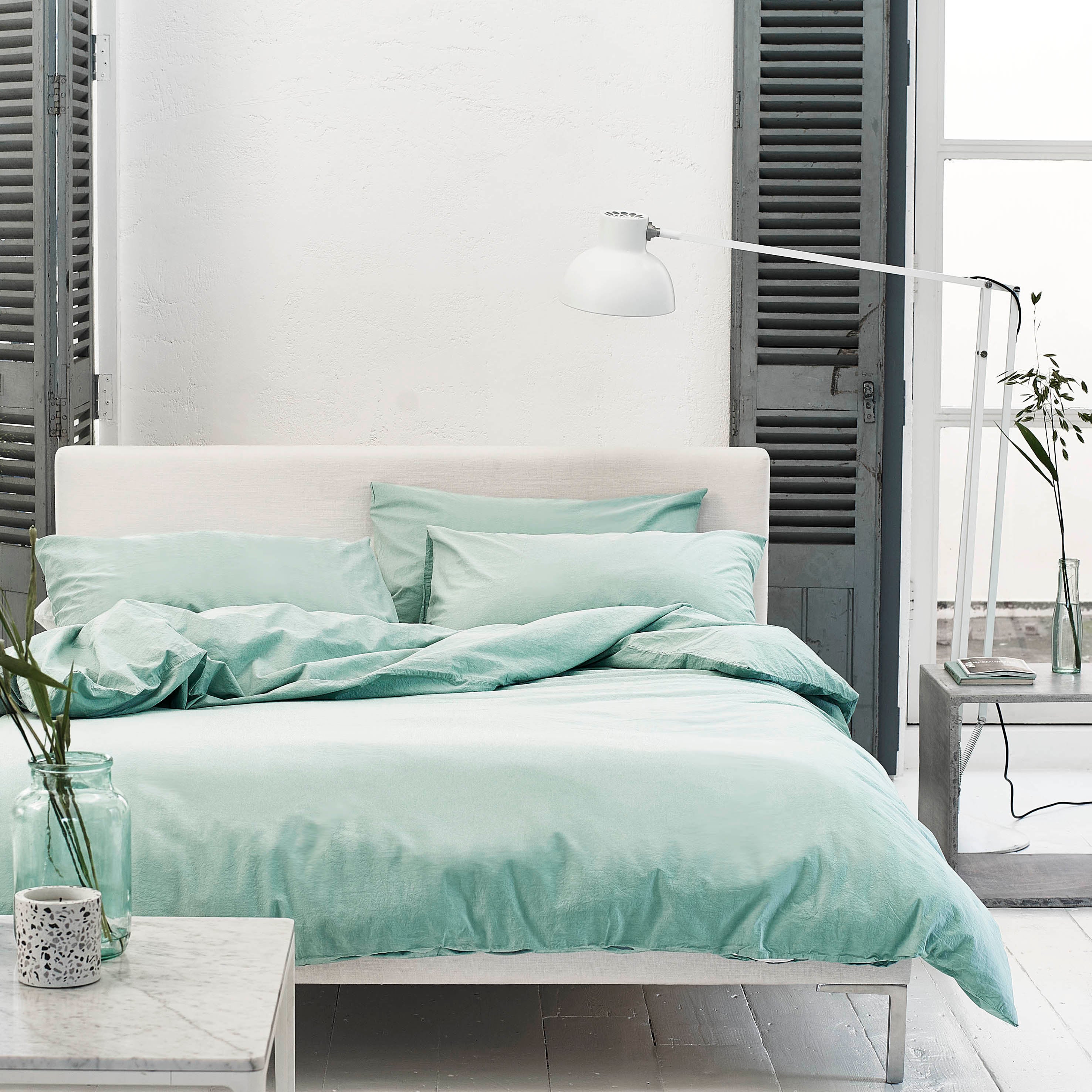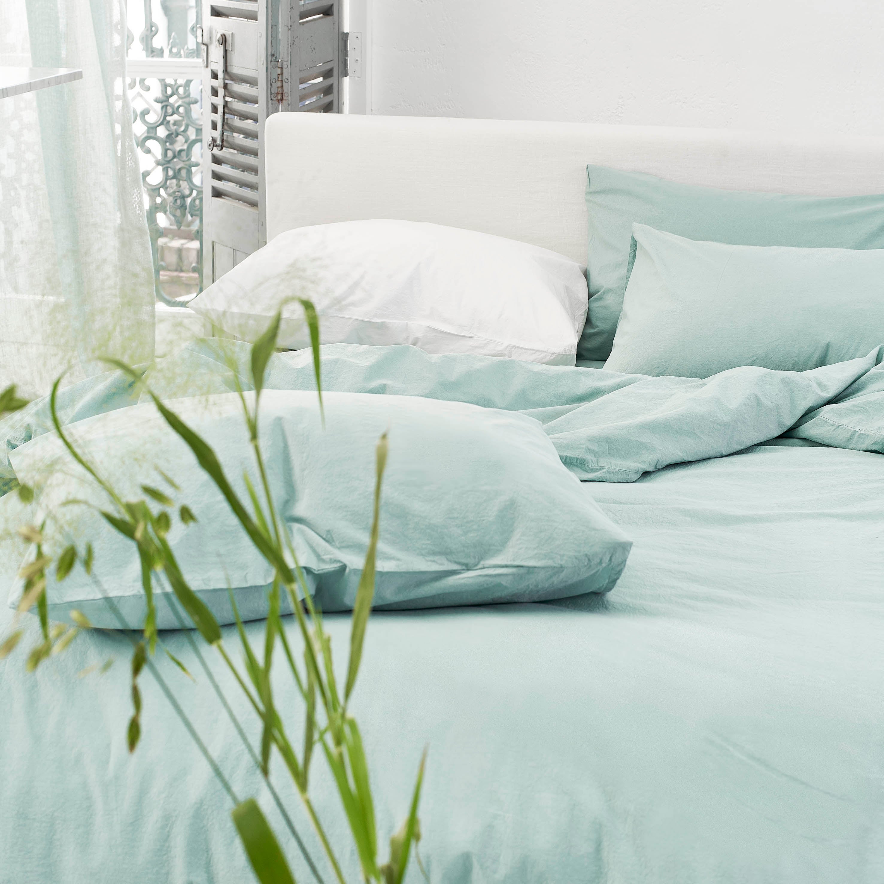 This premium bedding set combines GOTS certified organic cotton in a crisp 300 thread count percale construction with sophisticated porcelain green tones drawn from natural inspiration. The fabric's distinctive soft, relaxed texture results from carefully controlled dyeing and washing techniques, delivering a refined yet understated elegance to any bedroom. Backed by Made in Green certification, the collection reflects genuine environmental stewardship. Presented in sustainable, plastic-free reusable packaging and finished with an elegant coconut shell button, this collection appeals to discerning customers who prioritise both ecological integrity and refined comfort.
