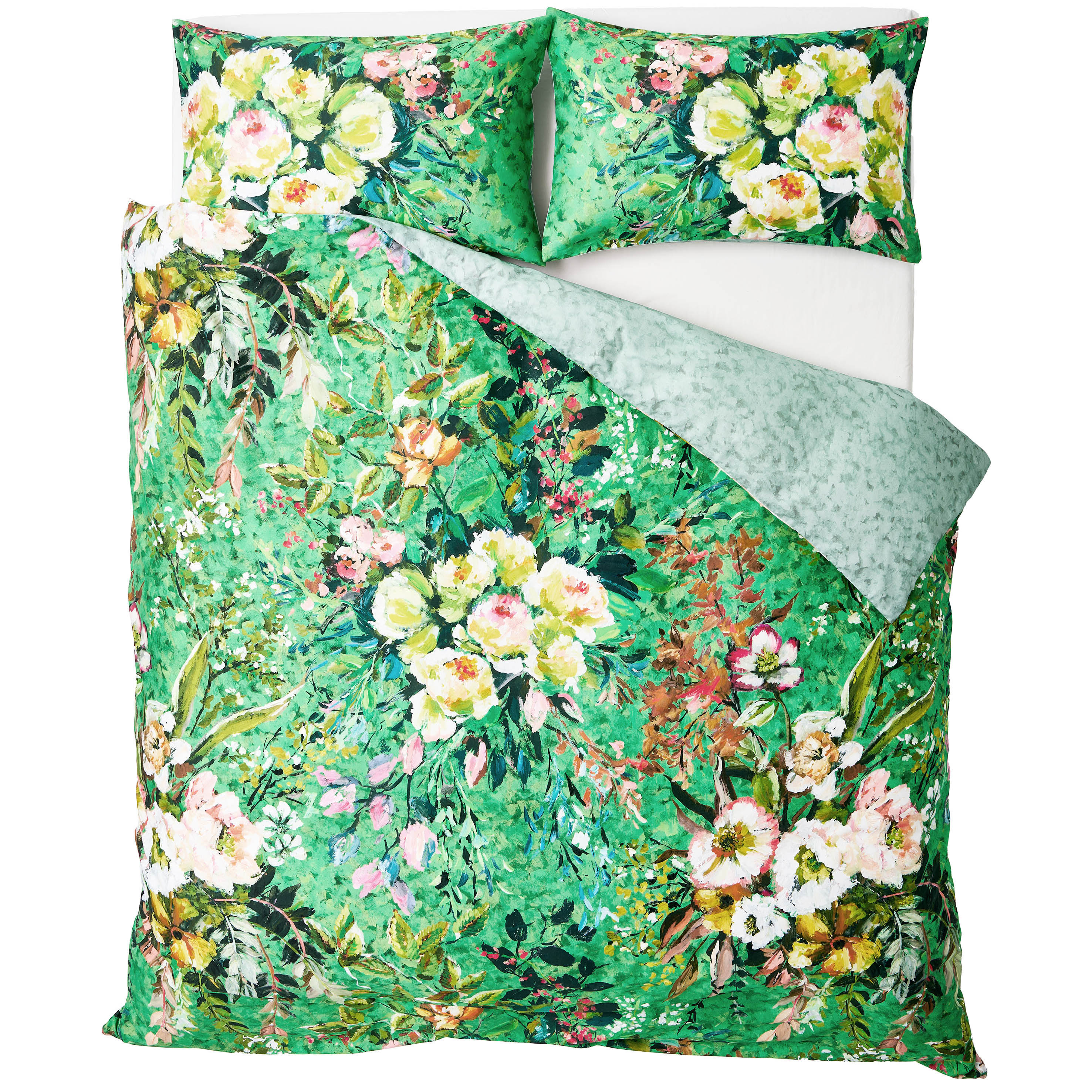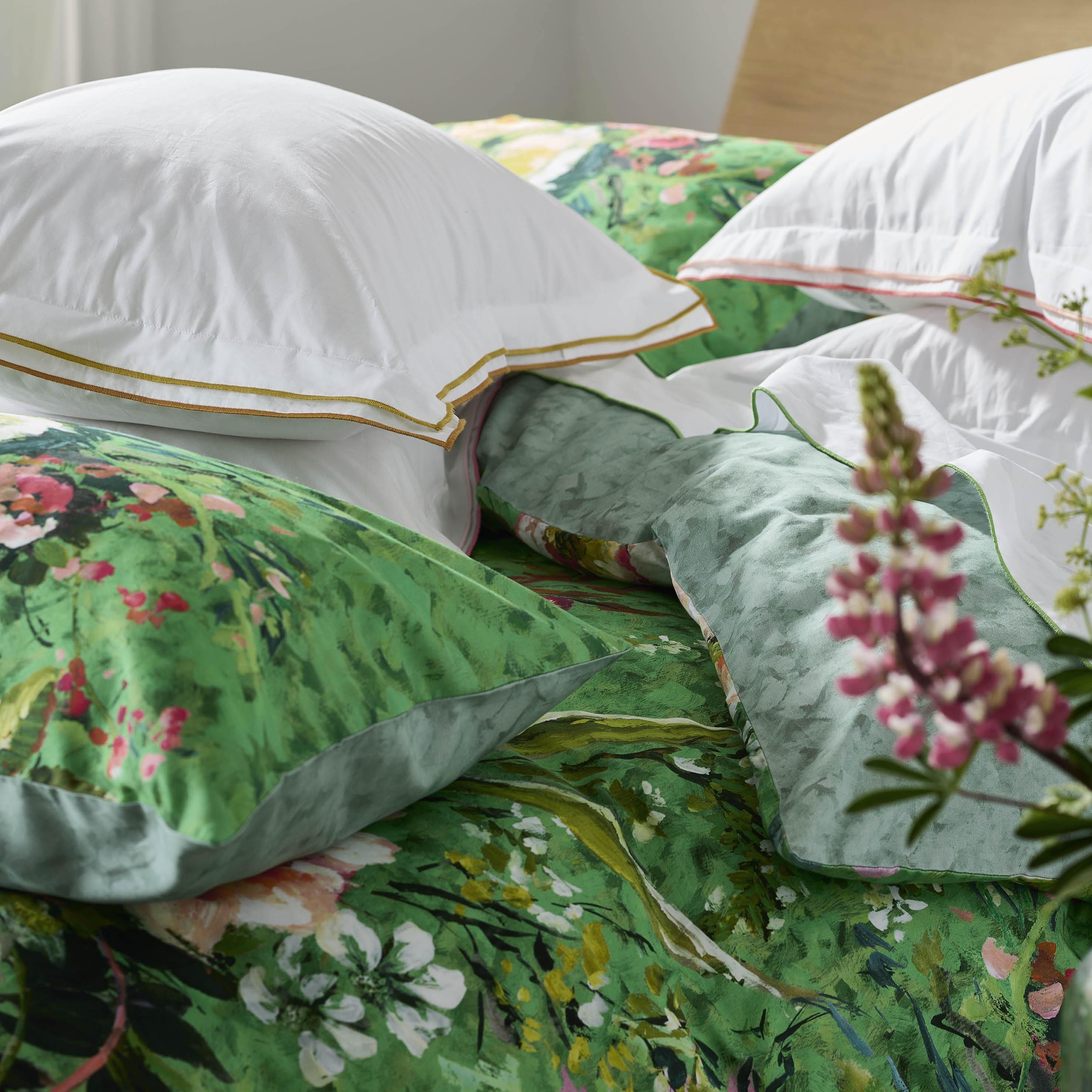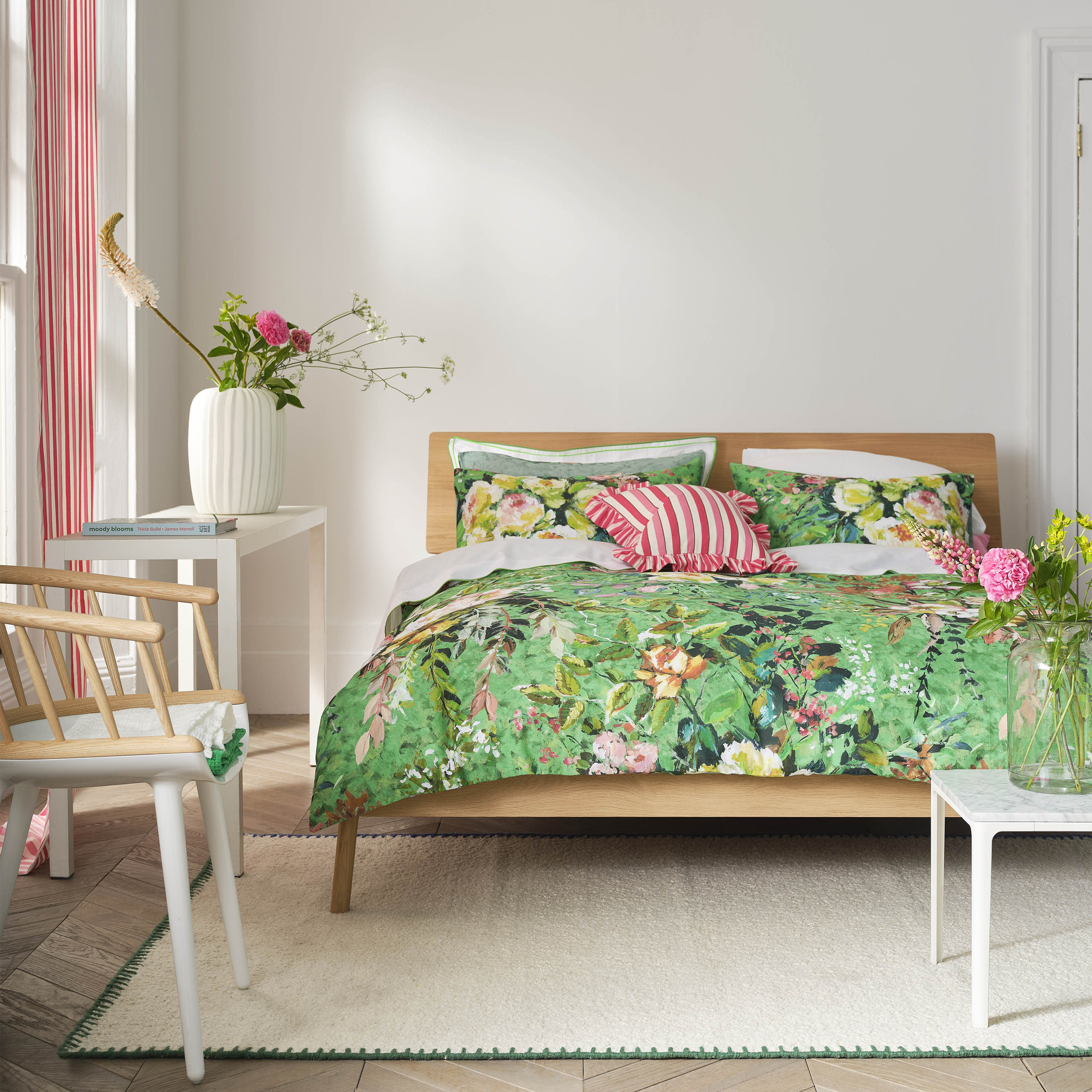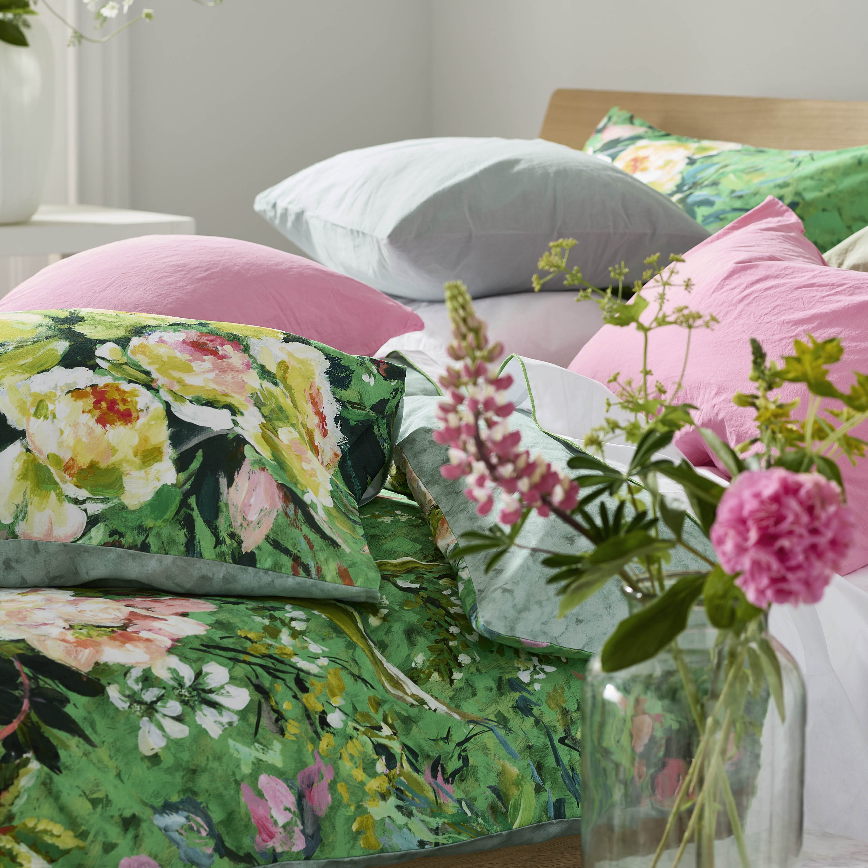 Elevate your bedroom with this striking Designers Guild duvet cover, featuring bold artistic florals in rich emerald tones. The design showcases expressive botanical motifs rendered at an impressive scale, creating an undeniably sophisticated focal point. Crafted from premium 200 thread count cotton percale, the fabric offers a refined feel with a textured reverse print that adds depth and visual interest. Distinctive coconut shell button fastenings provide an artisanal finishing touch.