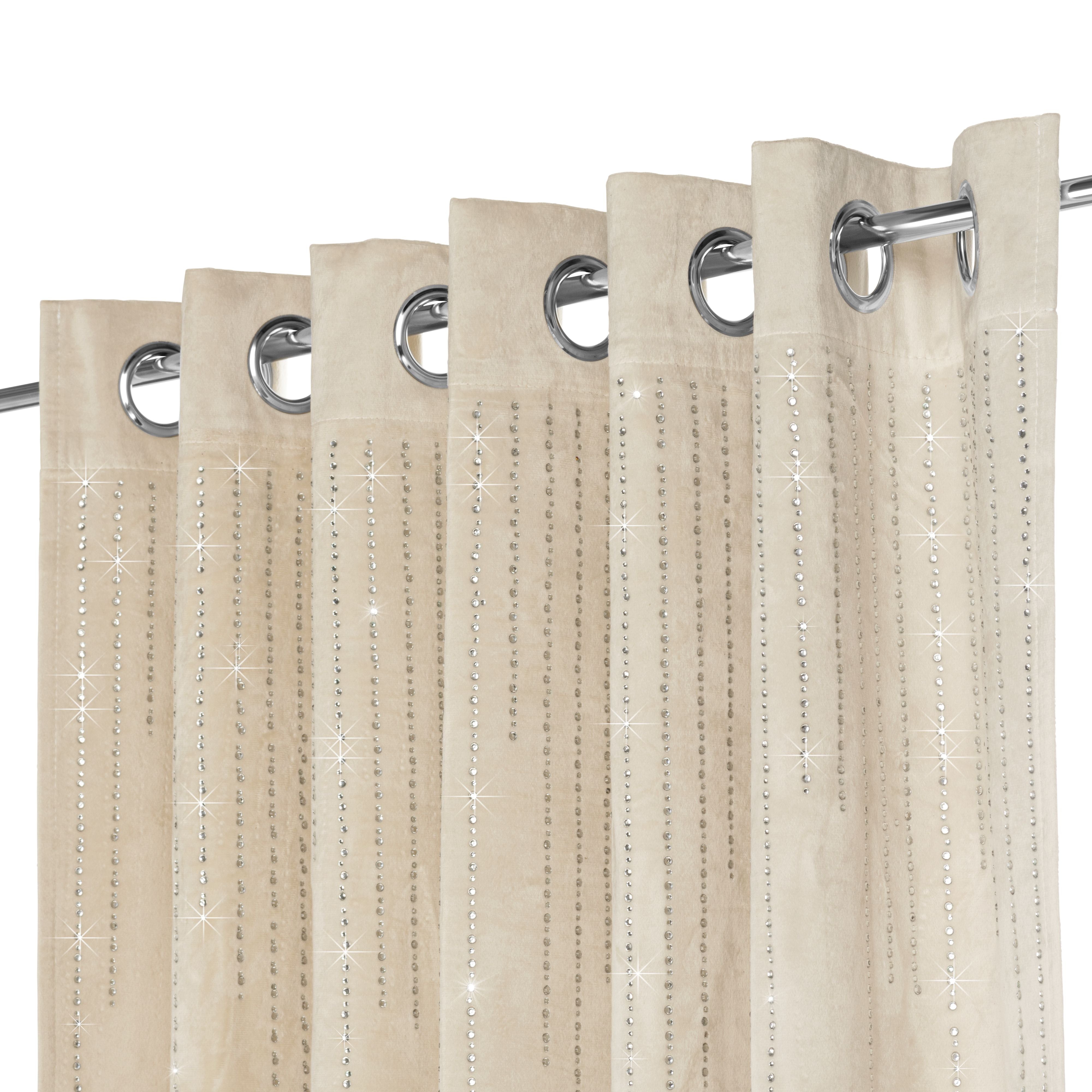These velvet blackout curtains feature an elegant diamante cascade design and convenient eyelet heading for effortless installation. The dense velvet fabric provides superior light-blocking properties, making these curtains ideal for bedrooms and media rooms where darkness and thermal insulation are priorities. The sophisticated cream tone complements contemporary and traditional interiors alike, while the decorative diamante detailing adds a touch of refined glamour to any window treatment scheme.