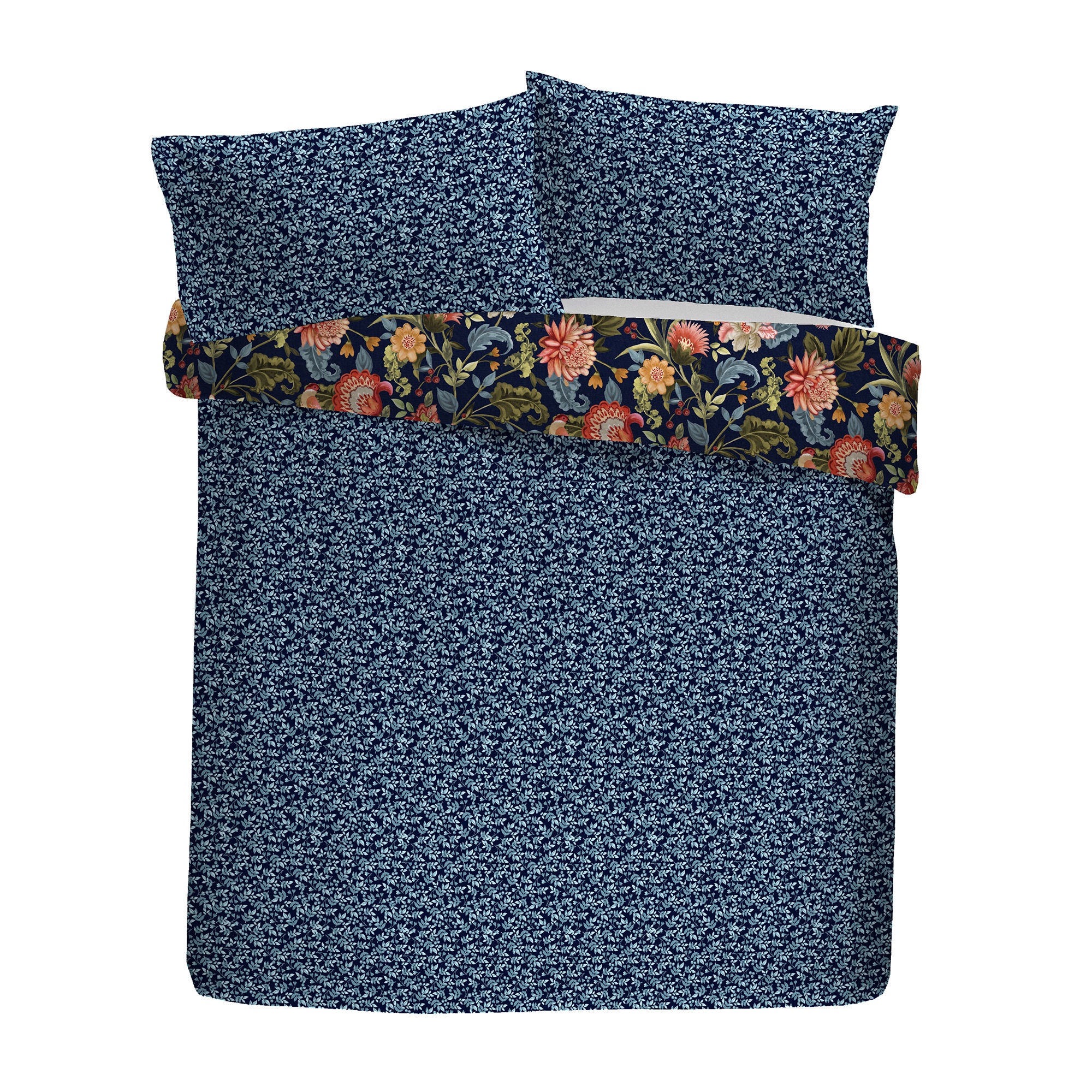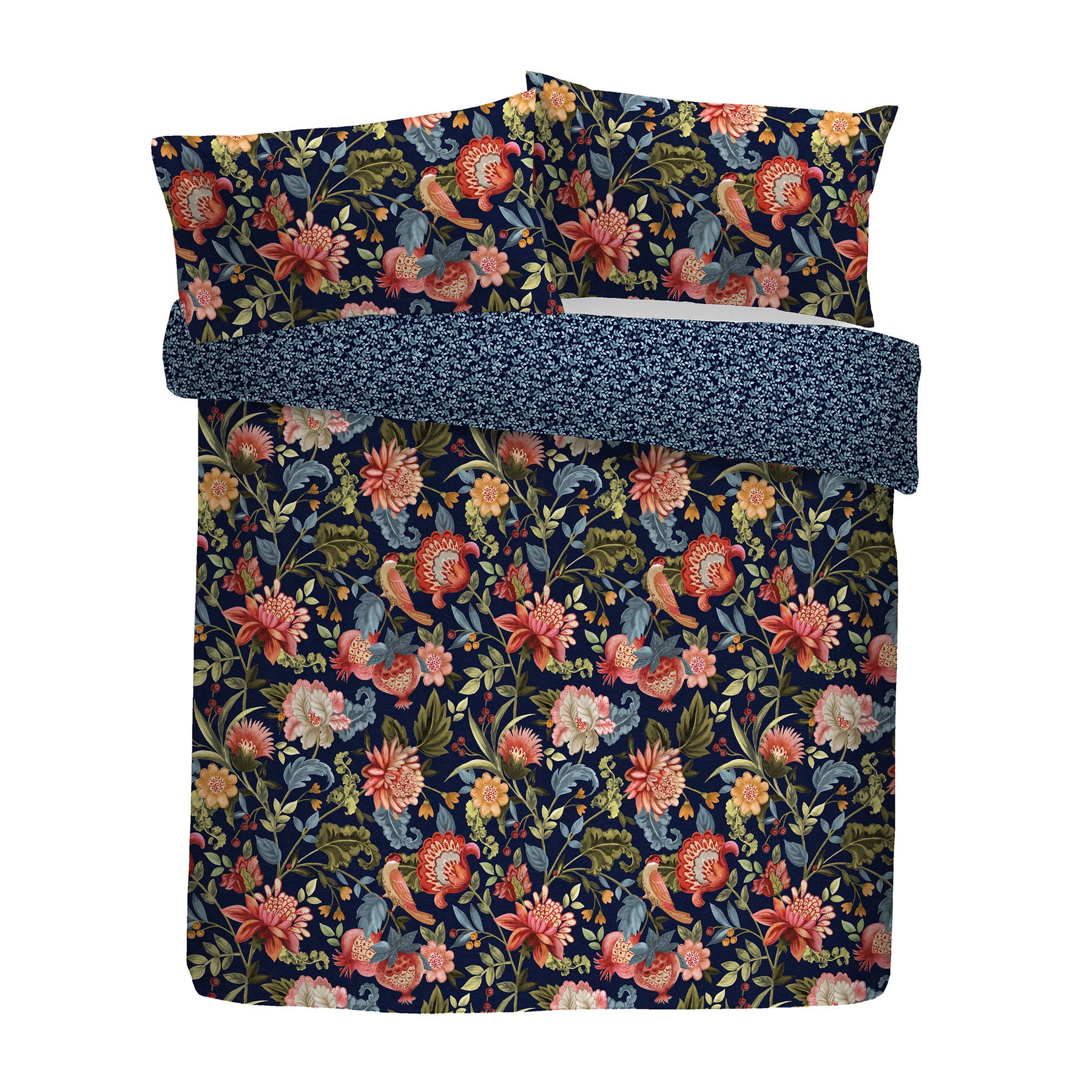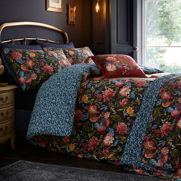 Experience enduring sophistication with the Bejewelled Duvet Cover Set. Showcasing a hand-painted floral motif accented by fruits and birds, paired with a contrasting foliage pattern on navy. Made from soft, breathable 100% cotton, it is fully reversible and secured with a button closure, embodying refined classic style.