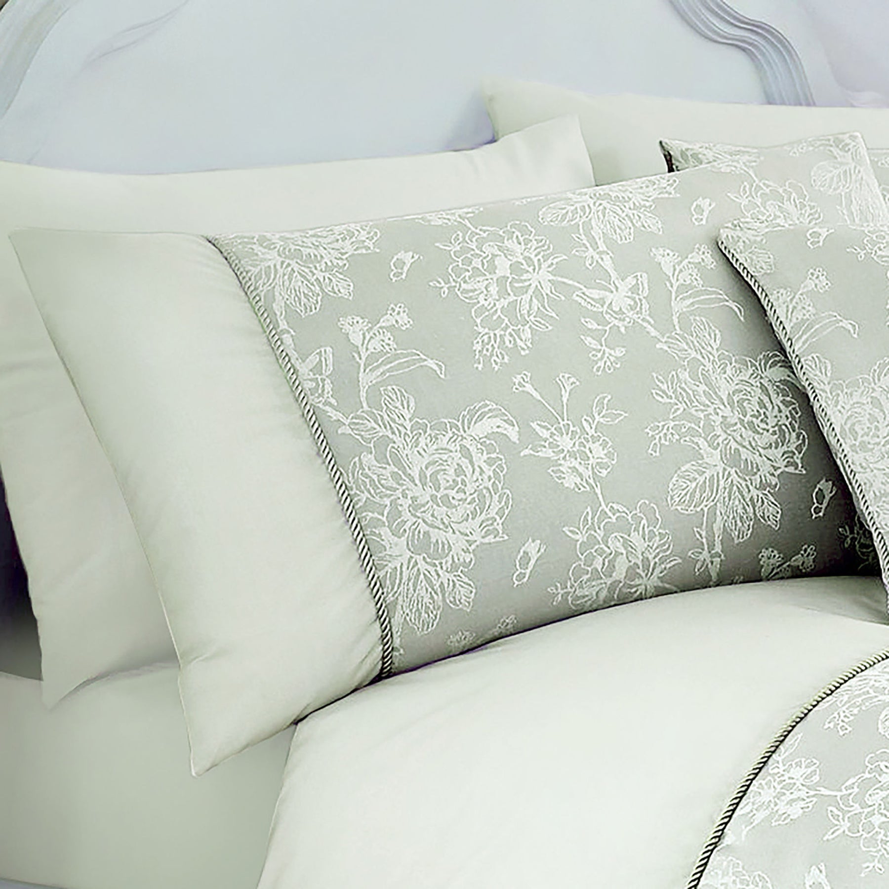 The Jasmine bedding set features a timeless floral Jacquard design woven into a substantial, cotton-rich fabric. Its classic style is elevated by a rope-effect border and a solid-colour top cuff, forming an elegant collection that brings a sophisticated touch to any bedroom.