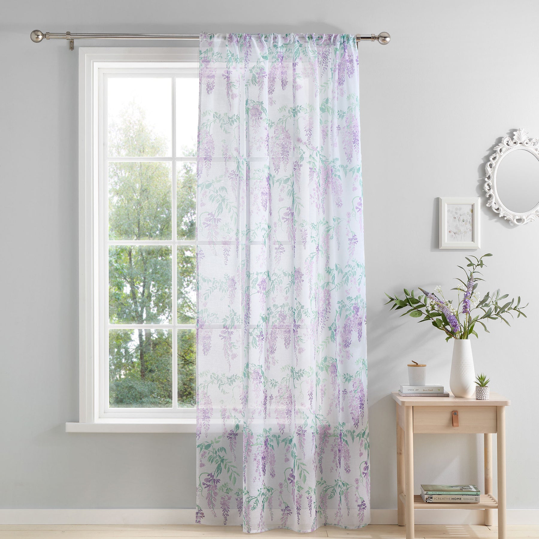 Experience the perfect combination of elegance and privacy with Dreams & Drapes' Wisteria Floral Ready-Made Single Voile Curtain in Lilac. The delicate hand-painted wisteria design on fine voile fabric adds a touch of luxury to your home. With easy installation and machine washable care, you can effortlessly elevate your space with timeless charm.