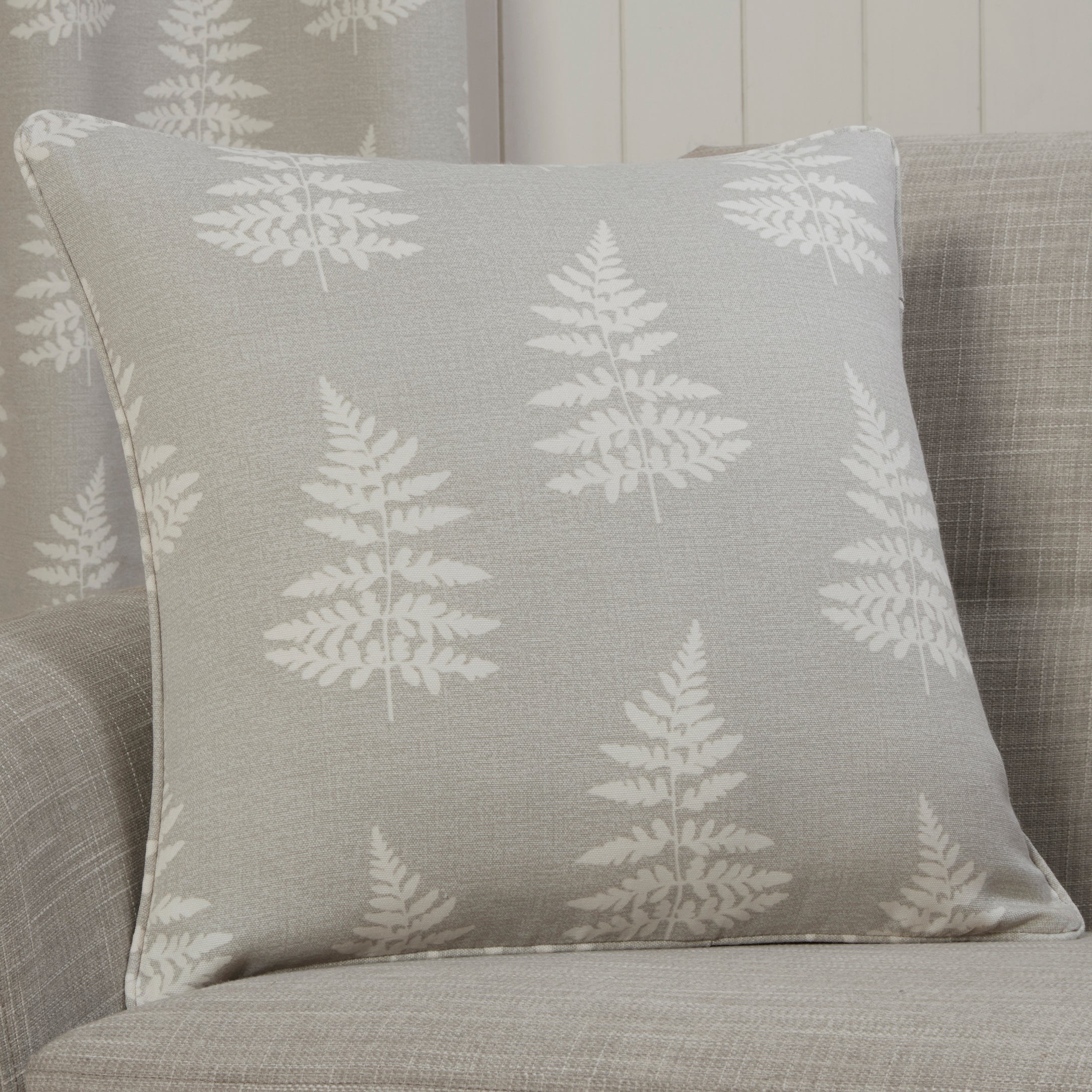 Our design Esher is the perfect addition to any room. A simplistic ‘fern’ leaf printed to a modern scale in three on-trend colourways. Available as an eyelet curtain along with self piped cushions.