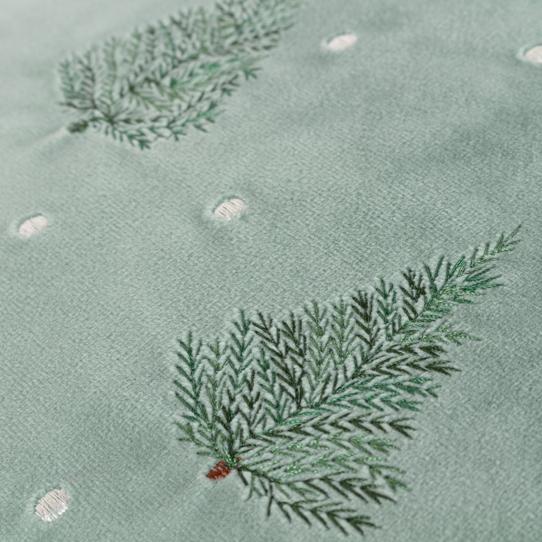 The traditional and serene Evergreen cushion gives a subtle tribute to Christmas with its exquisite embroidery of trees and polka dots that represent soft winter snow. For a coordinated, festive look, pair this pattern with our brushed cotton duvet cover set. It is placed on a mint green velvet backdrop and has a complementary bottle green velvet reverse.