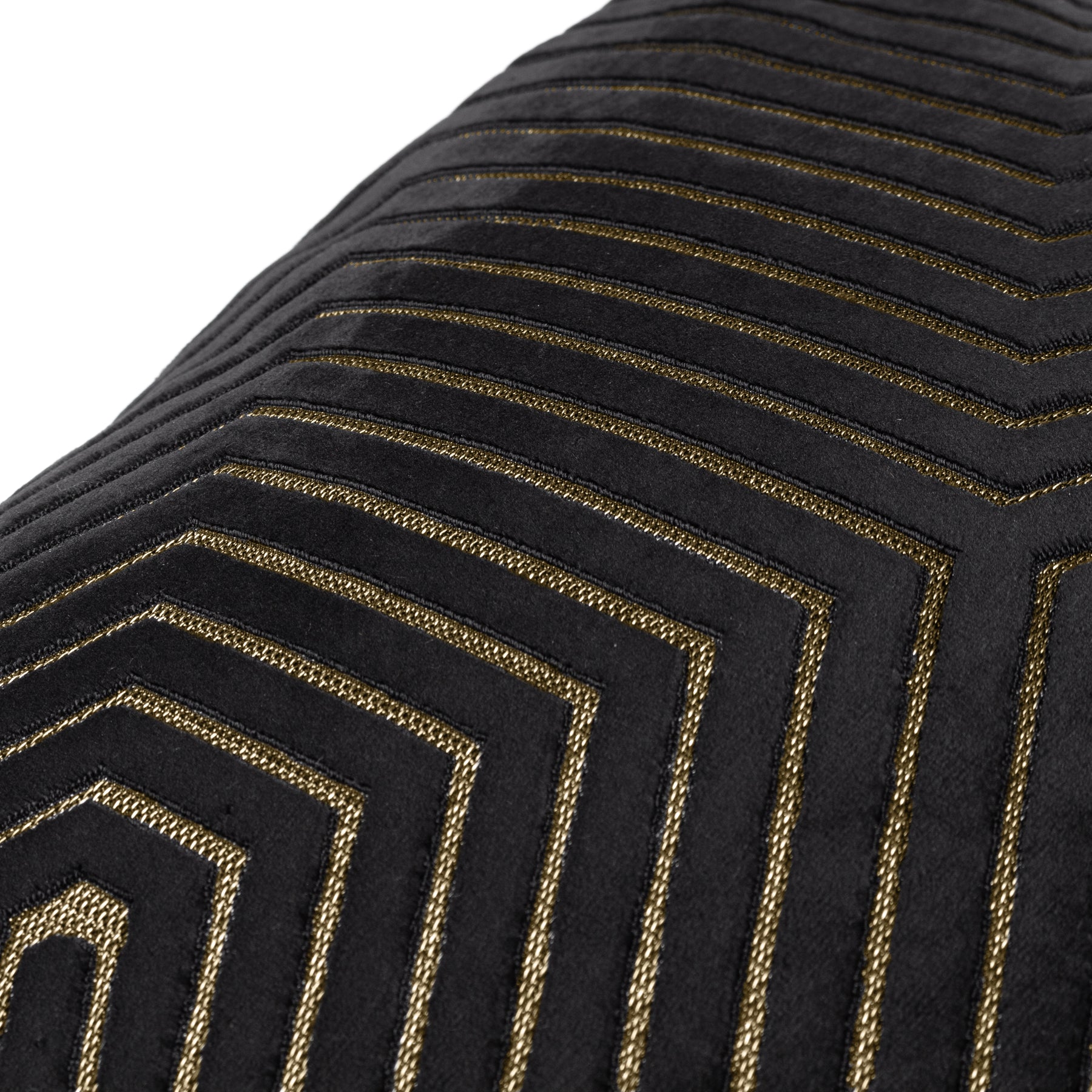 A lavishly styled cushion with captivating, powerful geometric cut velvet detailing that commands attention on stage. The Evoke cushion stands out thanks to its strong golden weaving of metallic threads running through the base fabric and its jewel-toned backdrop. Finishing touches include a subtle knife-edged trim, a concealed zip, and a plain velvet reverse. To fit your opulent retreat, layer them tones-on-tones or in vibrant contrast.