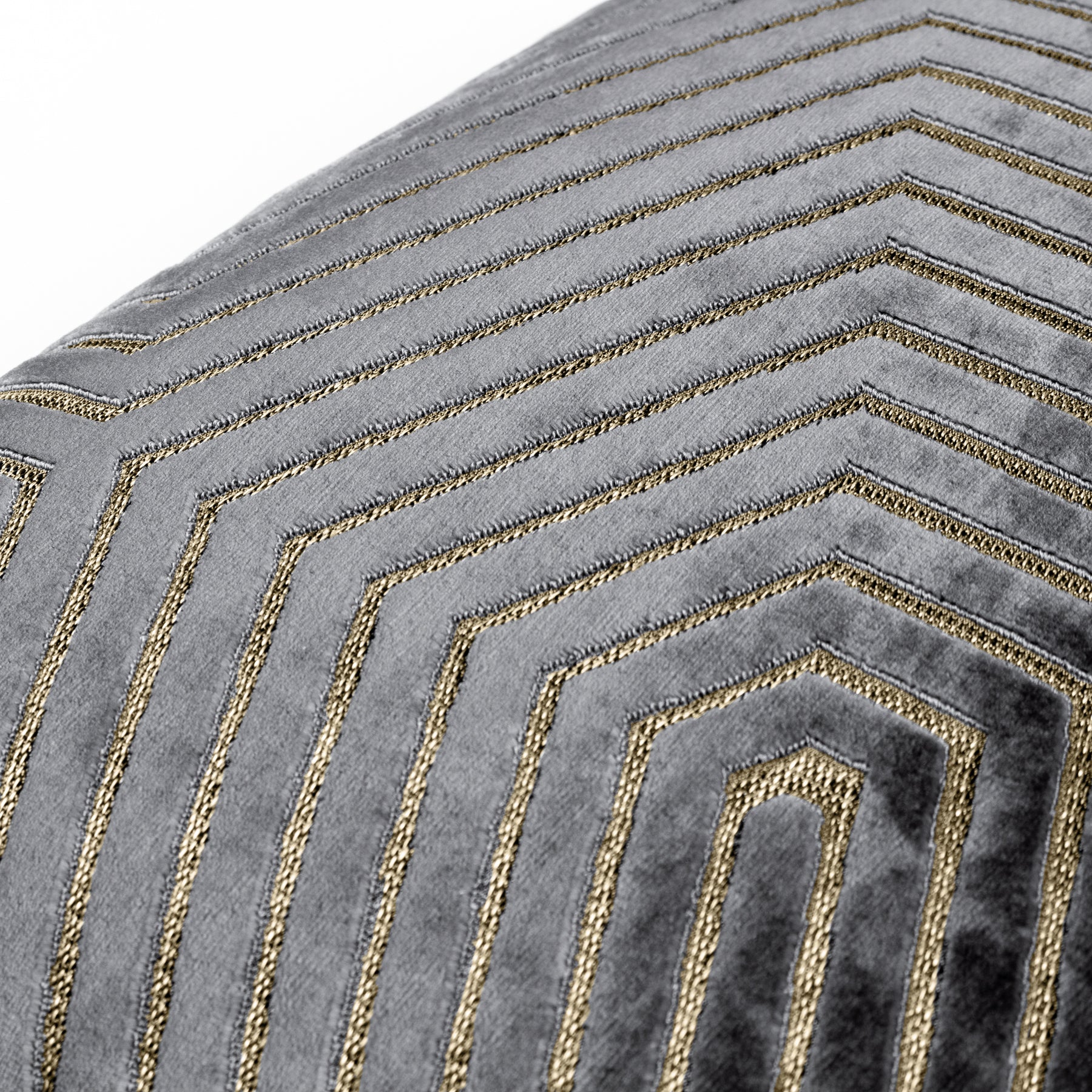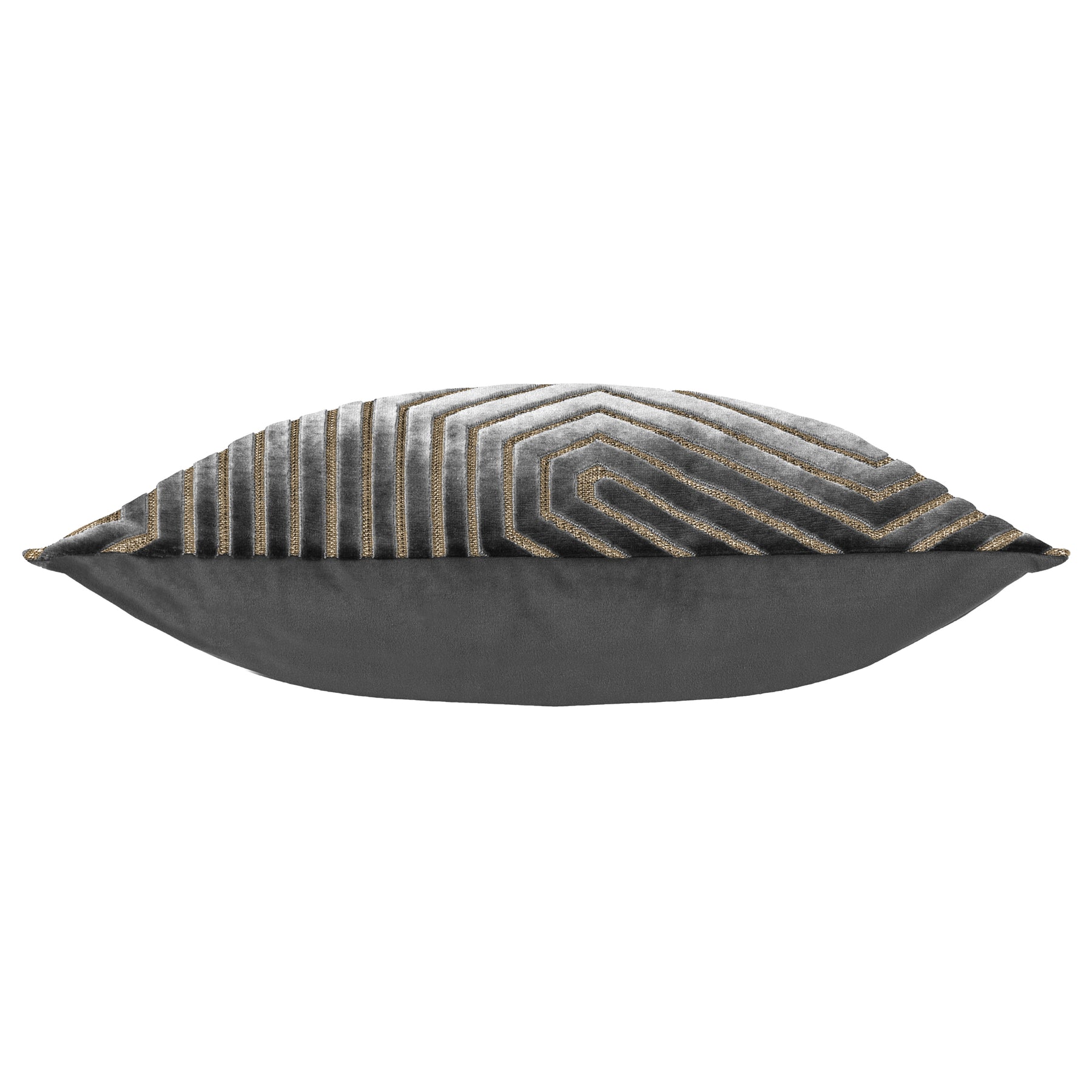 A lavishly styled cushion with captivating, powerful geometric cut velvet detailing that commands attention on stage. The Evoke cushion stands out thanks to its strong golden weaving of metallic threads running through the base fabric and its jewel-toned backdrop. Finishing touches include a subtle knife-edged trim, a concealed zip, and a plain velvet reverse. To fit your opulent retreat, layer them tones-on-tones or in vibrant contrast.