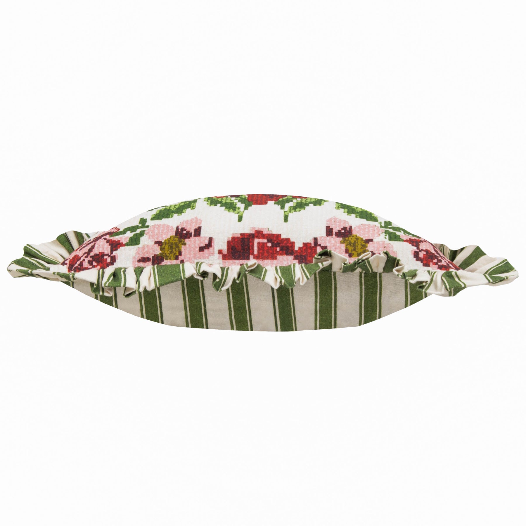 The Feeoni Ruffle Cushion showcases a striking floral print on smooth cotton, mimicking the appearance of a handmade tapestry. It includes a striped backing and graceful ruffled trim. With a sophisticated colour scheme, it epitomises the charm of an English garden and brings a touch of Cottagecore to any living space.